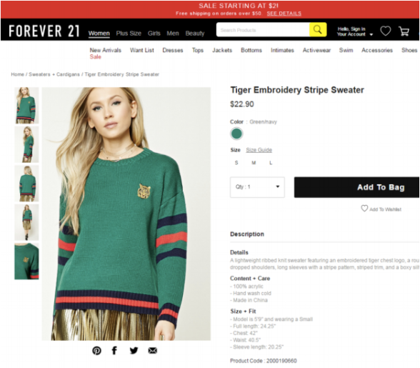 Gucci stated that the stripes are “confusingly similar” to their own and demanded that Forever 21 halt the sales of the infringing products, which includes chokers, bomber jackets and sweaters.