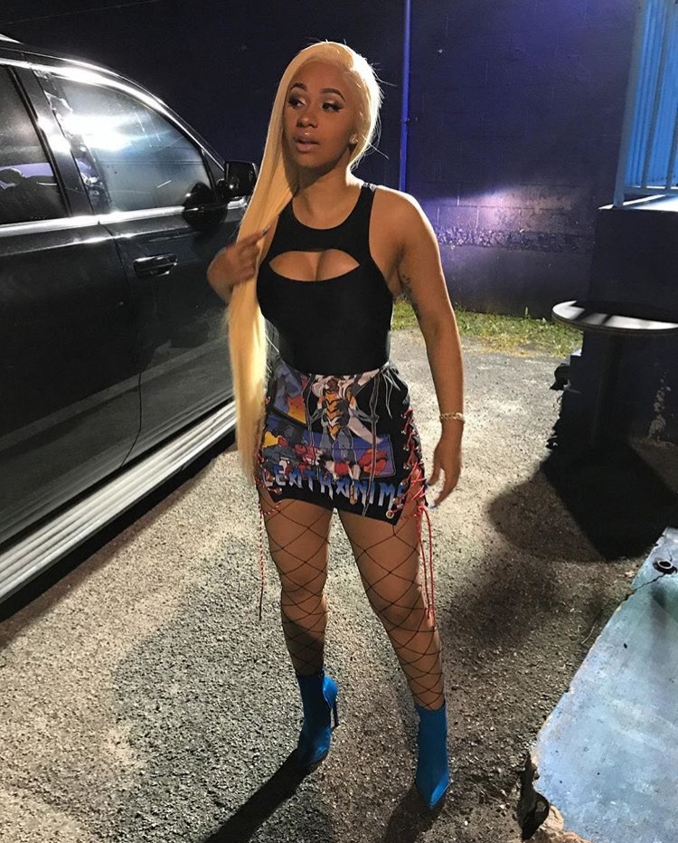 Bodak Yellow rapper and Boogie Down Bronx homegirl, Cardi B took to Instagram wearing a black cut out bodysuit, oversized fishnet tights, blue booties, and a $240 HMN ALNS Silver Grommet Paracord Lace Up Front Graphic Print Skirt: