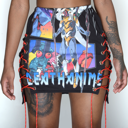 The colorful flap-front skirt features silver grommets and red reflective paracord laces. Front original artwork by HMN ALNS. Blank back.