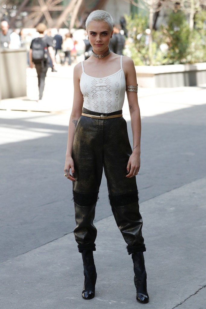 Cara Delevingne was the ultimate cool girl in a white cami, high-waist leather pants, and pavement-stomping boots.
