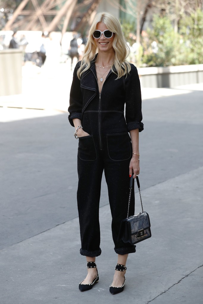 Claudia Schiffer looked every bit the supermodel in a black, zip-front jumpsuit and pearl-embellished flats.