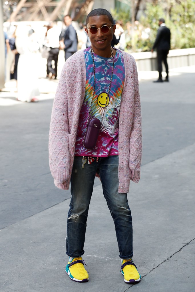 Pharrell was groovy in a tie dye tee, retro-inspired shades, his own Adidas kicks, and a cozy cardigan. I live for his style!
