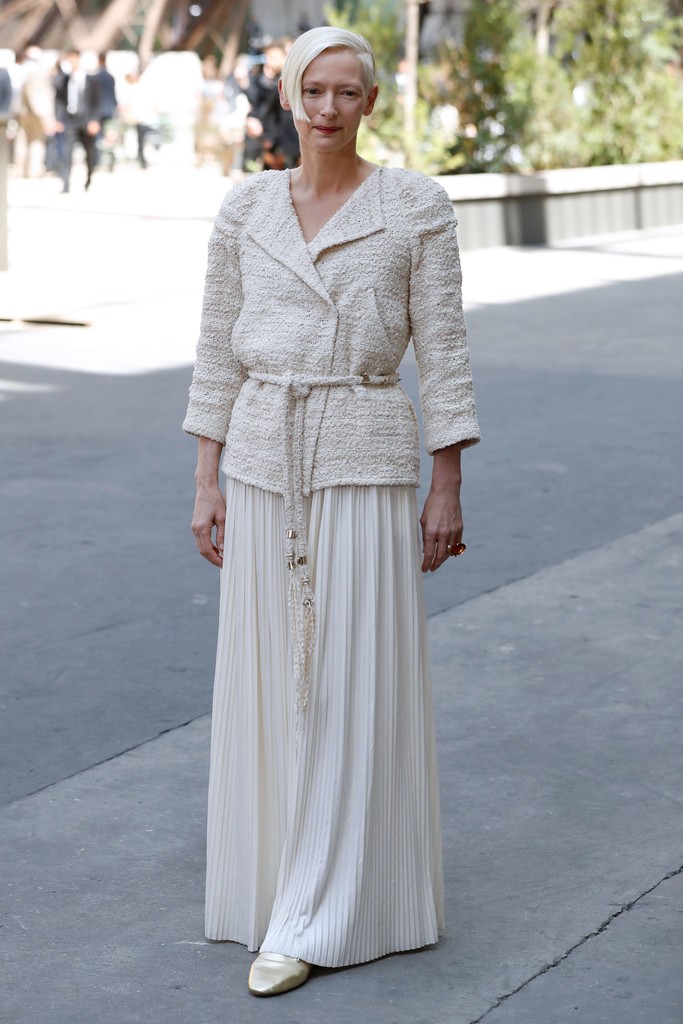 Tilda Swinton was angelic in a cream tweed, tie-waist jacket and a white pleated maxi skirt.