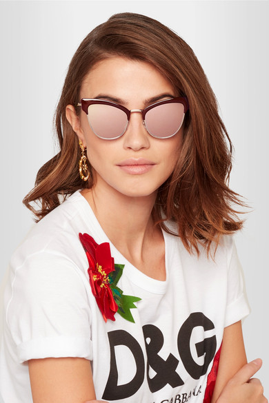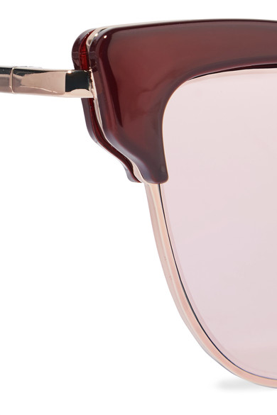 This chic pair is crafted with a tasteful gold-tone frame and burgundy acetate that complements the bold mirrored lenses.