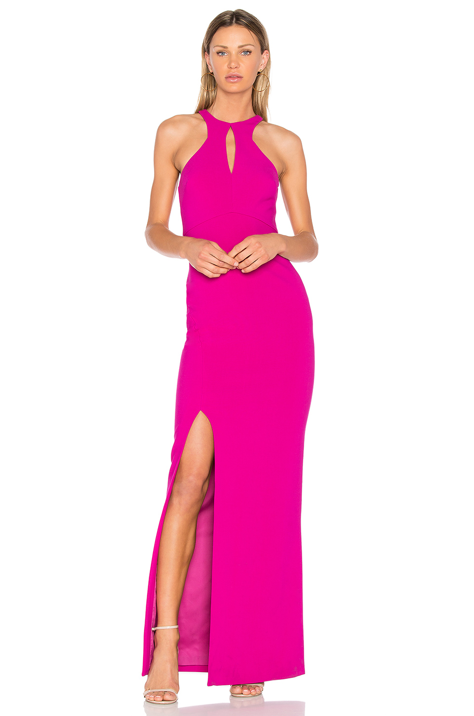 Her halter gown features a curve-hugging fit, keyhole detail, and side slit.