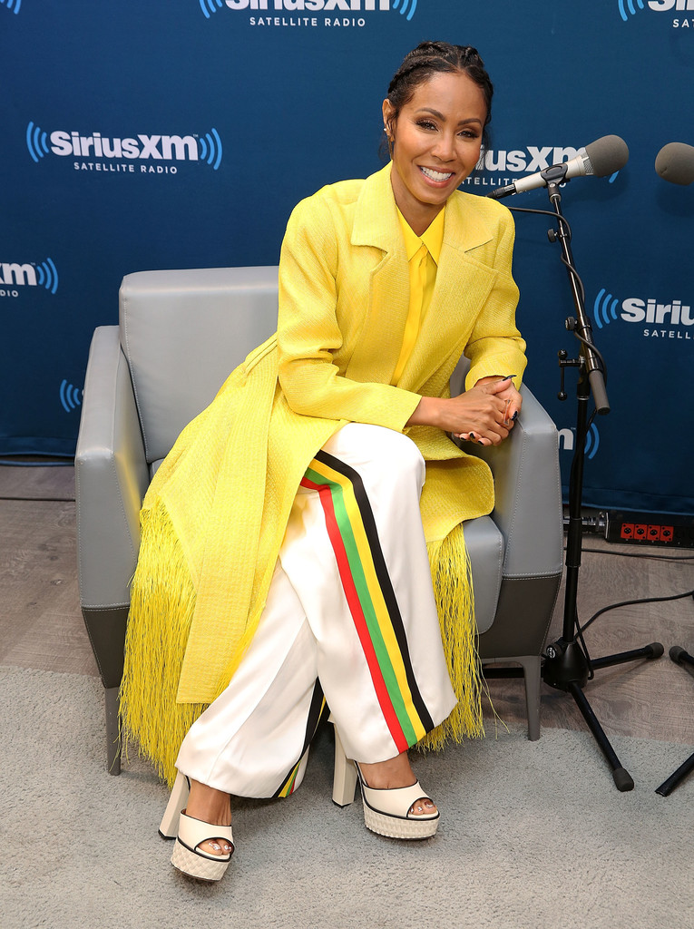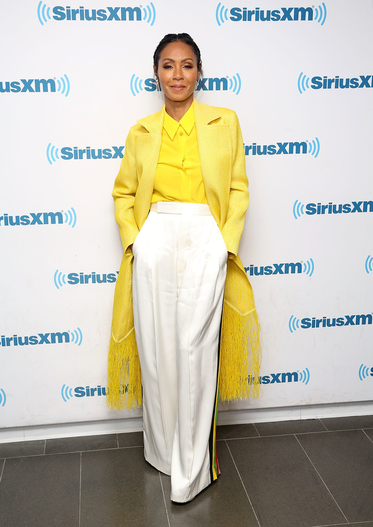 Jada Pinkett Smith went bold during an appearance on The Hoda Show, radiant in a pair of Céline Pre-Fall 2017 contrast side stripe trousers, $5,219 Maison Rabih Kayrouz Yellow Frayed Coat, and $1,130 Givenchy Yellow Chiffon Shirt: