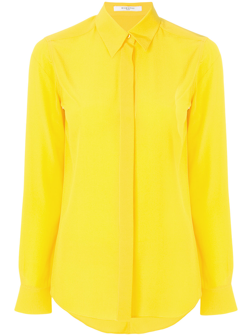 Her silk chiffon shirt boasts a classic collar, concealed button-front, long sleeves, and button cuffs.