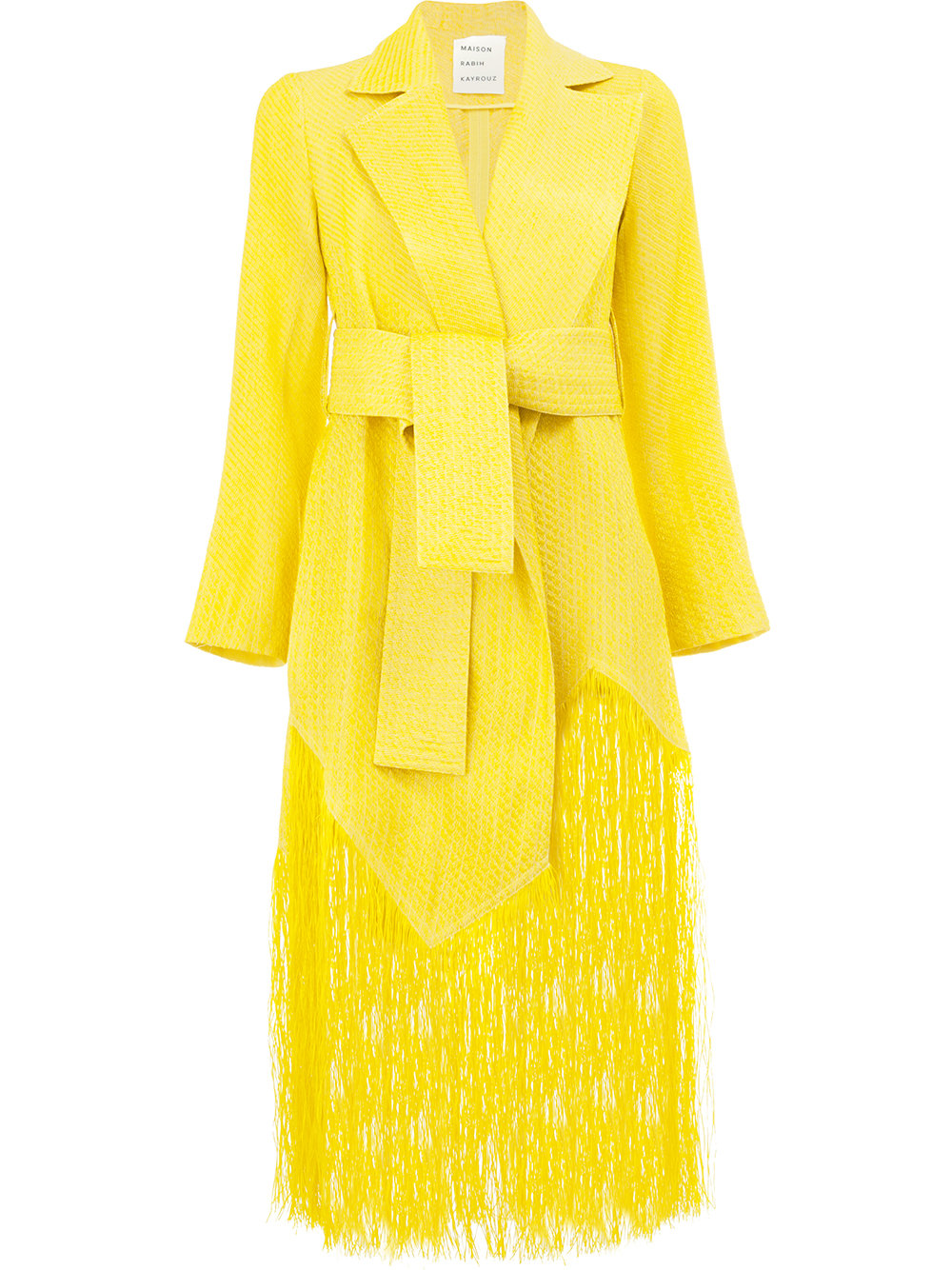 Her yellow coat features a tie-waist and fringe hem.