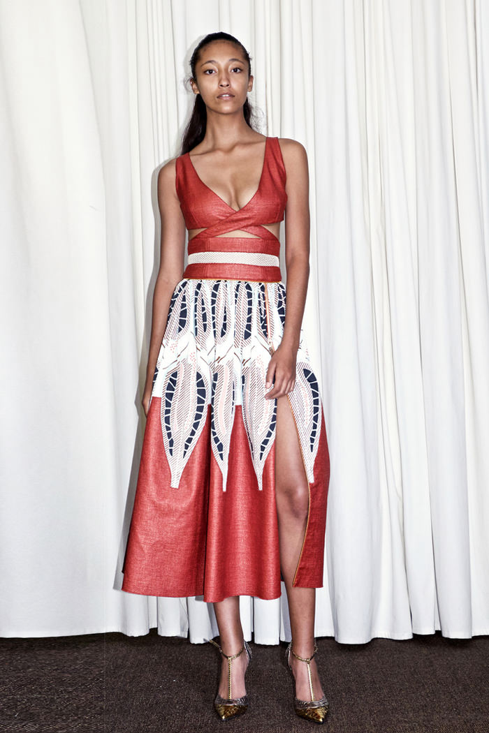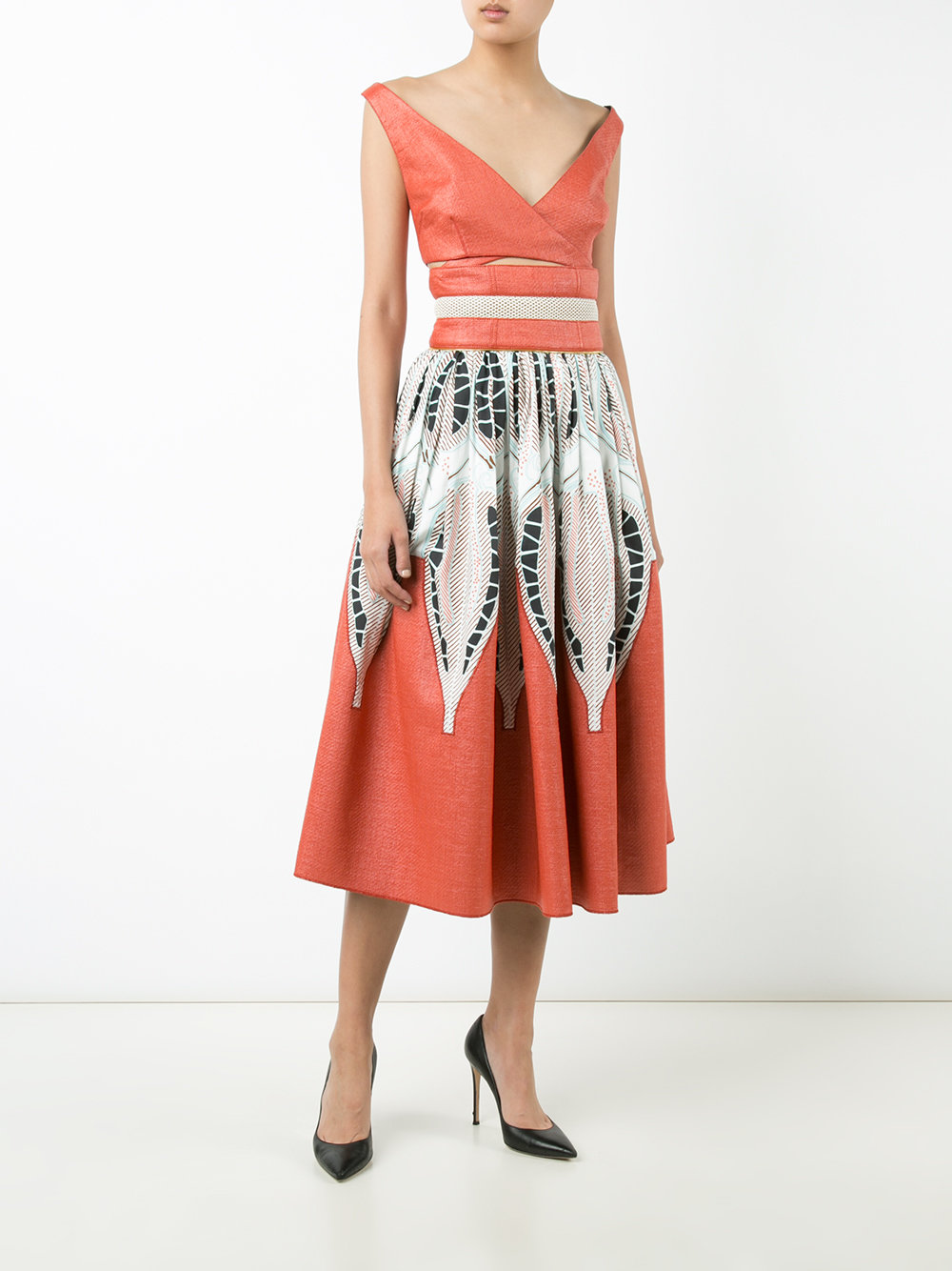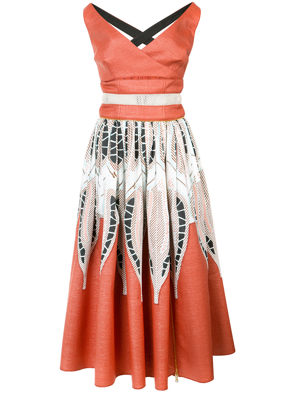 Her midi dress features a rust colored criss-cross upper with a statement zipped patterned panelled lower portion.