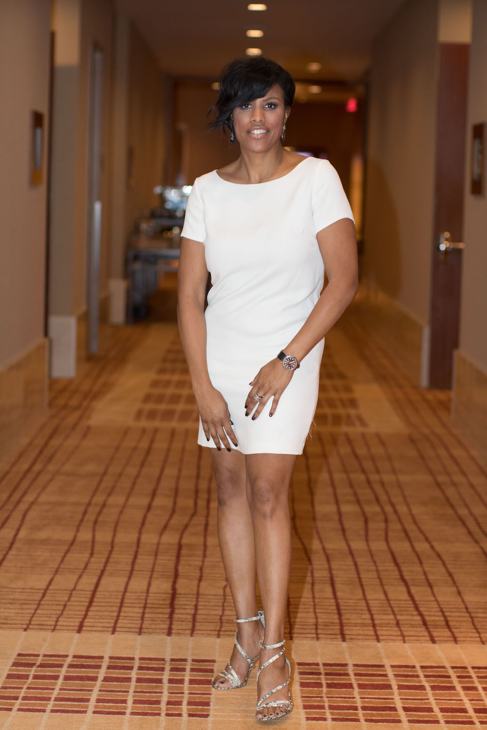 Angela Rye looked amazing in a form fitting white dress and matching pumps.