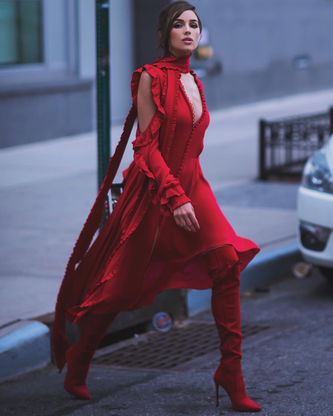 Olivia Culpo has been feeling red looks lately! Her latest ensemble was captured on the ‘gram—a $758 Madga Butrym Red Marbella Asymmetric Ruffled Silk Crepe Midi Dress: