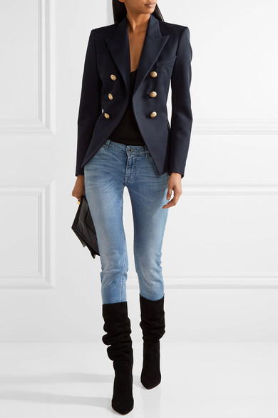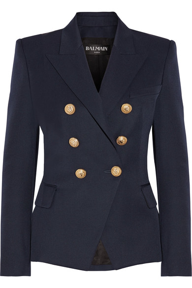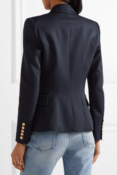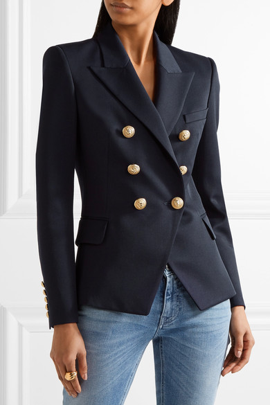 Her classic blazer is crafted from navy wool-twill in the label’s signature silhouette – structured padded shoulders, a nipped-in waist and double-breasted front adorned with gold lion-embossed buttons.