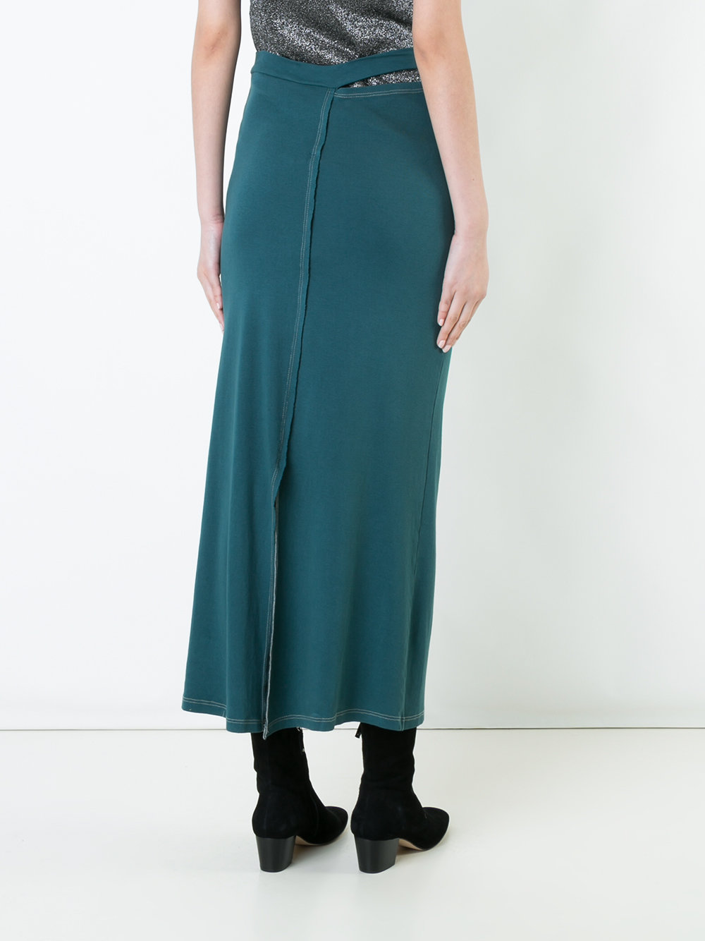 The paparazzi kept up with Kim Kardashian while she was out and about in Bel Air. The reality tv star was outfitted in a black bandeau top and a $131 Eckhaus Latta Green Cutout Lapped Skirt: