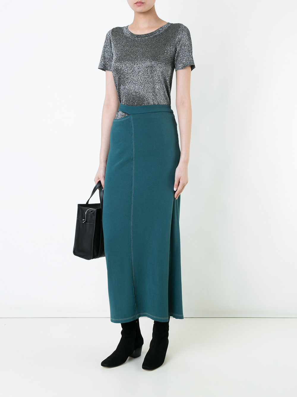 The waist band accented stunner also boasts stitching in white along the center seam and hem.
