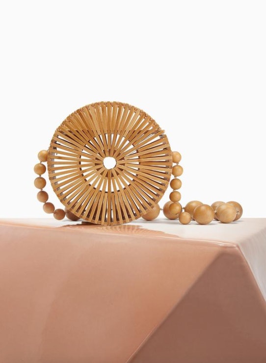 Her bamboo bag boasts a beaded shoulder strap, flat closure, and circular shape.