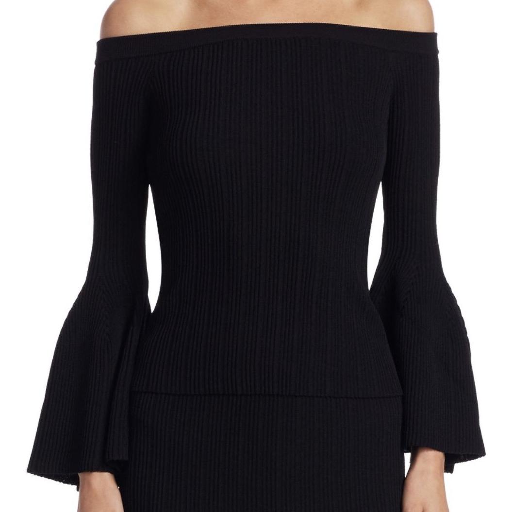Her ribbed top features an off-the-shoulder neckline and bell sleeves.