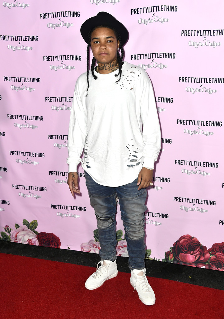 Young M.A. kept it casual in a fedora, destructed sweatshirt, denim, and white high-top kicks.