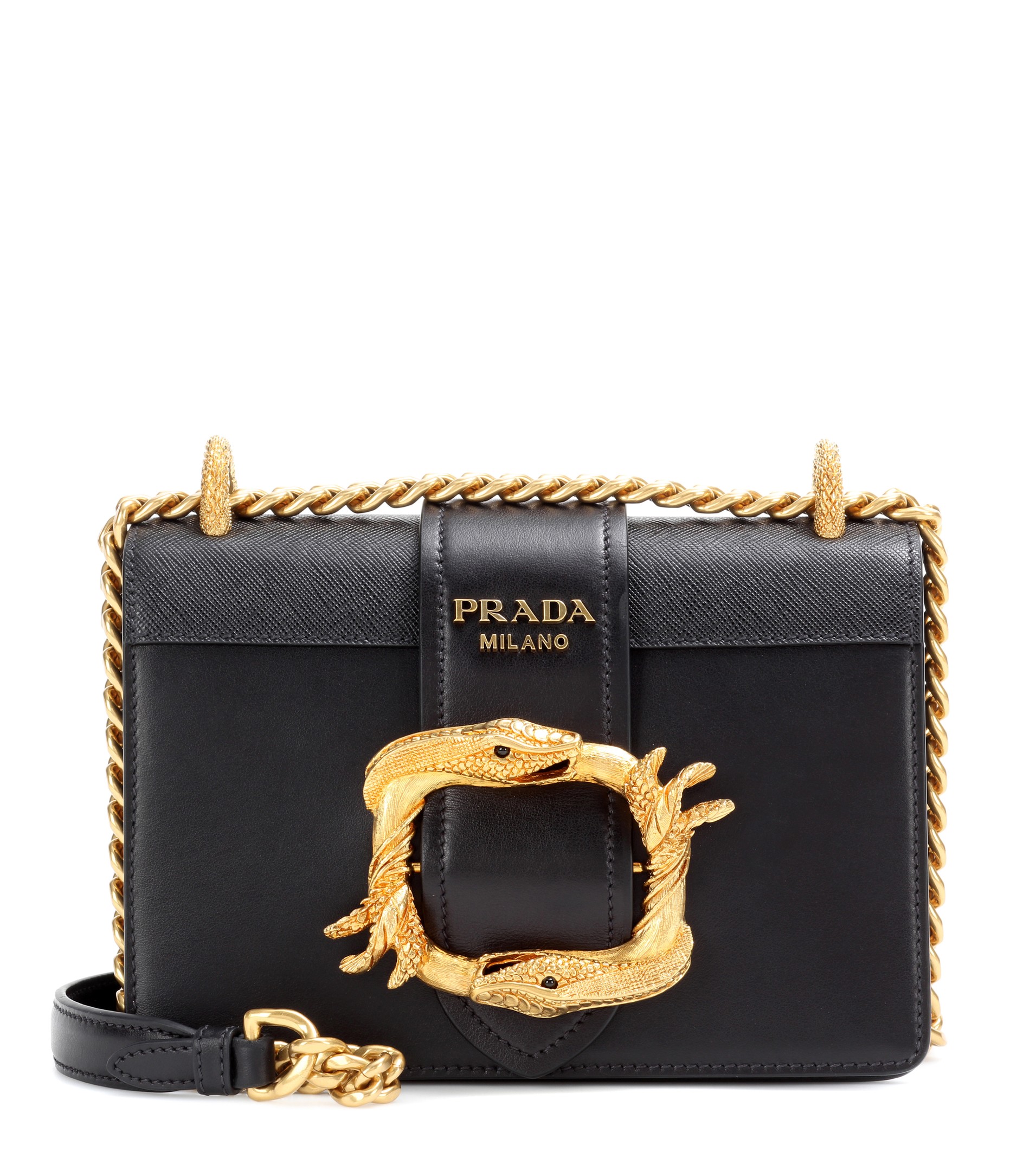 Her black leather shoulder bag boasts golden hardware and a gold chain link strap.