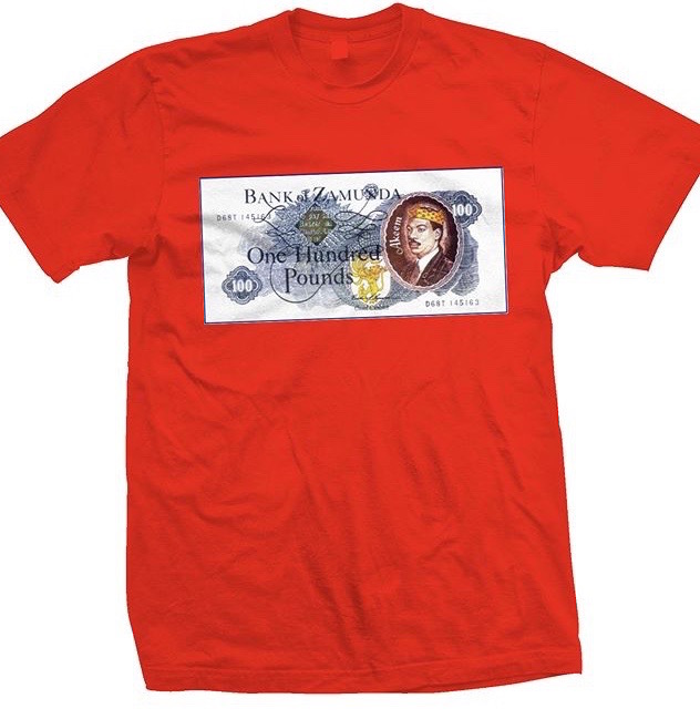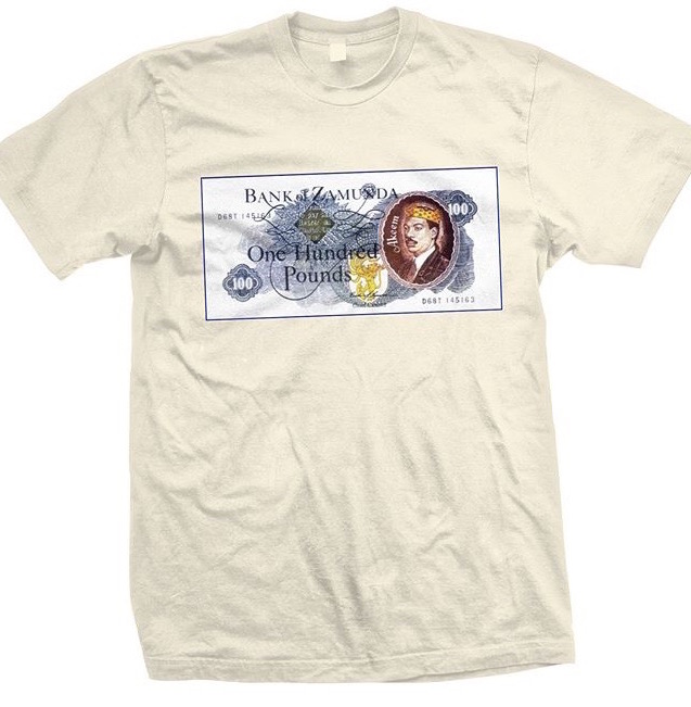 This Coming to America inspired tee features a printed “Bank of Zamunda” one hundred pounds graphic and is available in an assortment of colors including red, cream and white.