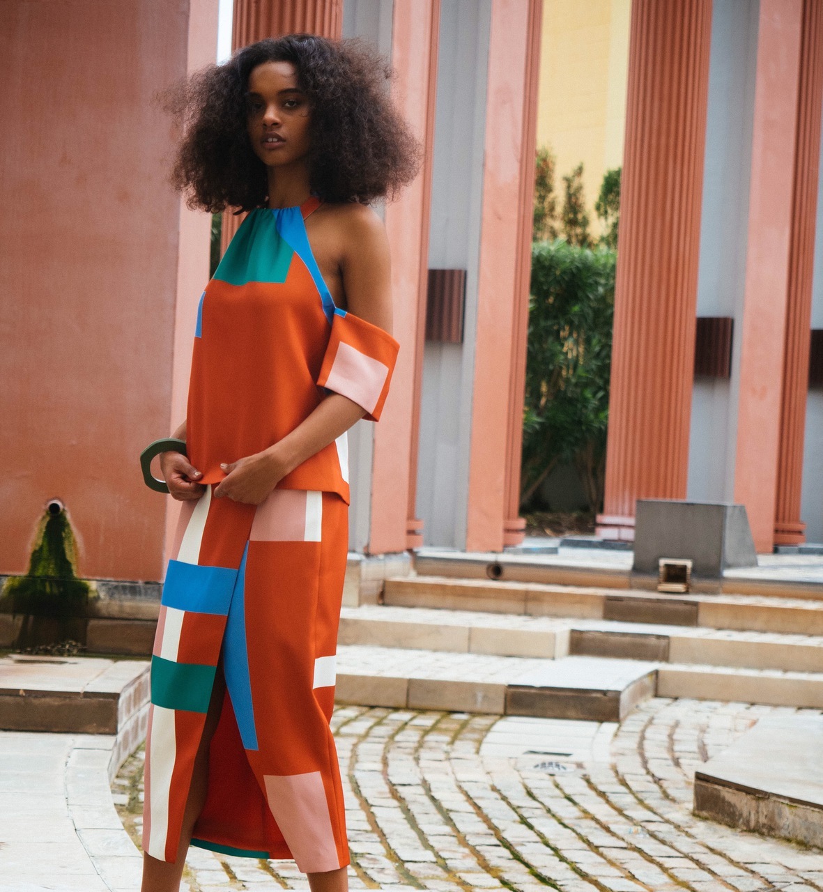 Made with mid-weight fabric this detailed color block stunner features a midi style design and front split. Hot!