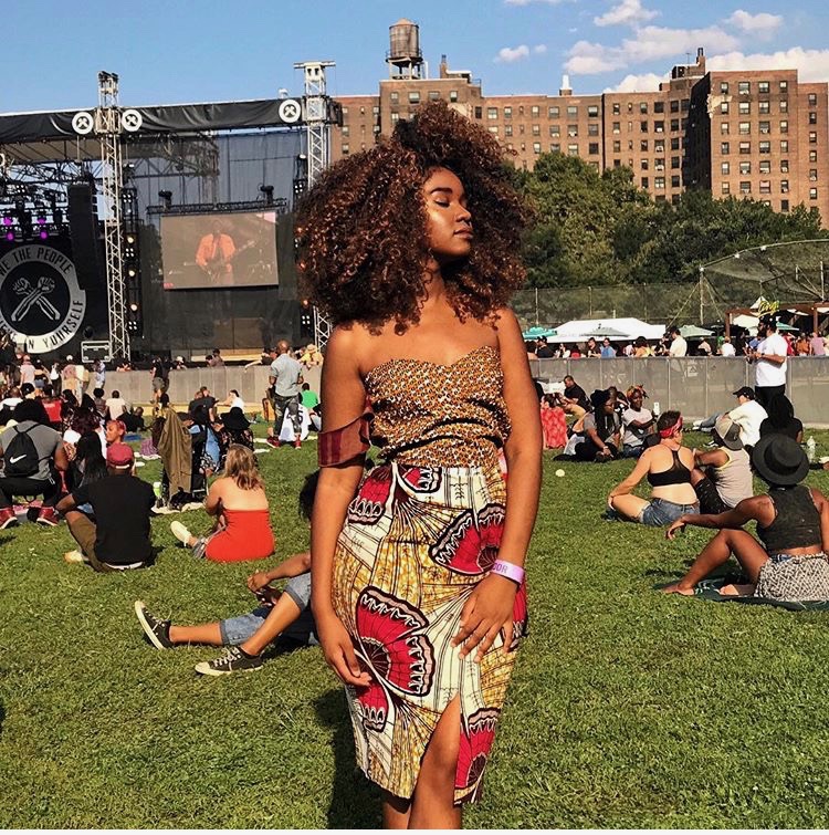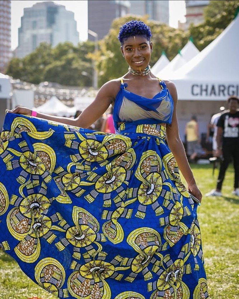 YouTuber Mila Koren (@milakoren) served a look with her African printed maxi skirt complementing her natural blue curls.