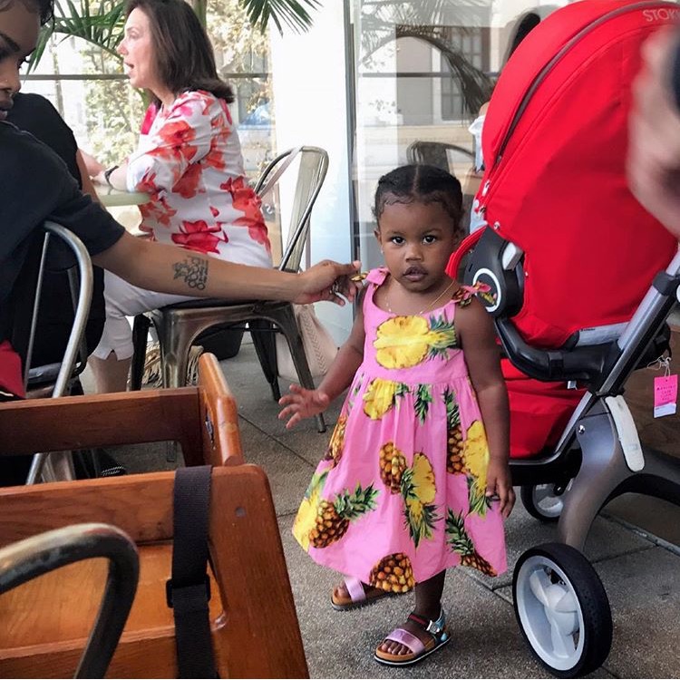 Last, but most certainly not least is Baby Junie who was as sweet as pie in a pink pineapple print Dolce & Gabbana mini frock paired with the cutest Gucci sandals to match. With her hair braided back in two french braids, this was the perfect kid fashion moment for a summer’s day. All I want to do is grab hold of those adorable cheeks of hers when I look at this. What a darling she is!