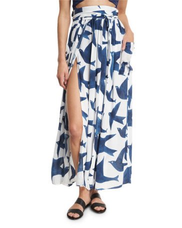 Her skirt boasts a bird print and two slits.