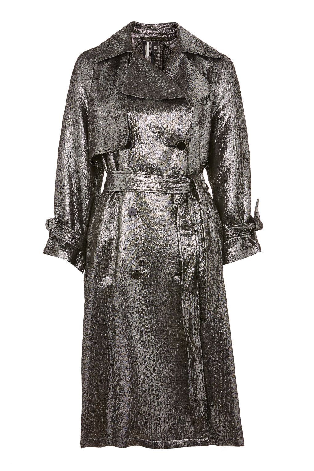 Made from shiny metallic material this double breasted piece features a self tie waist belt, notched lapels, pockets and buttons for fastening.