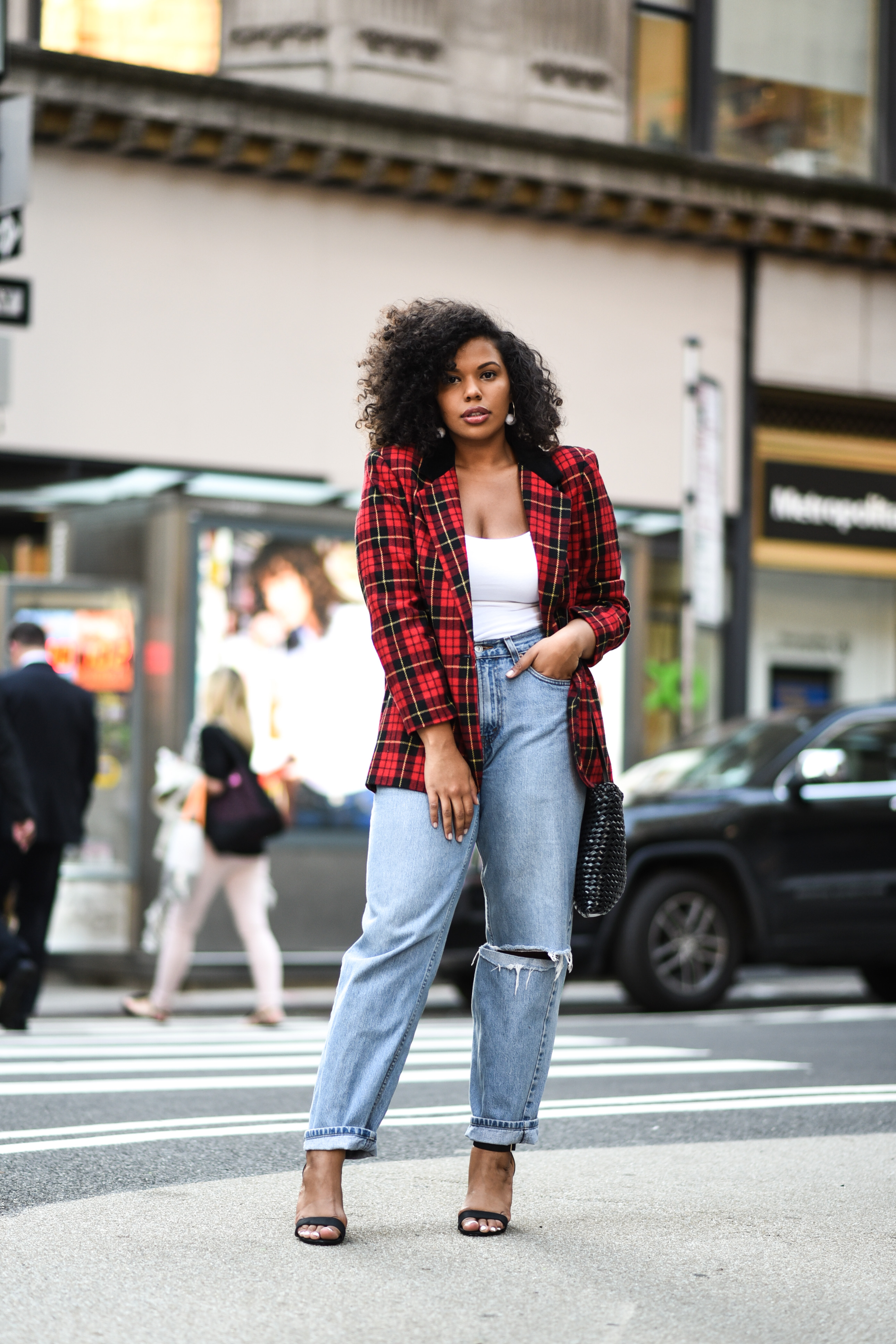 Blogger, @tylauren kept her look chic and simple and dressed it up with a plaid red blazer. Definitely a Fall necessity!
