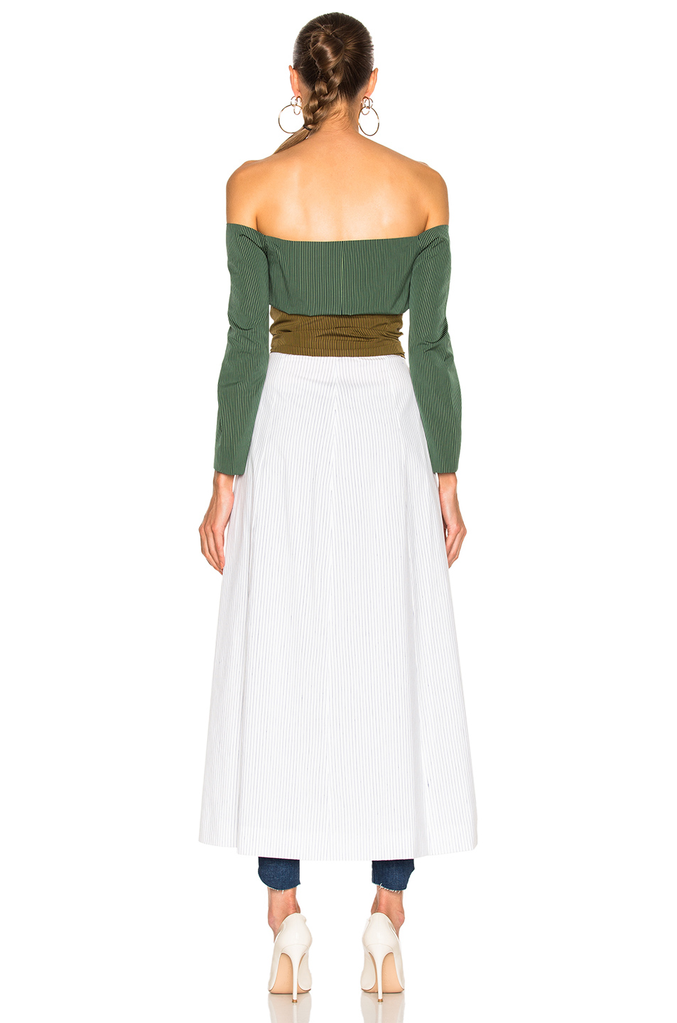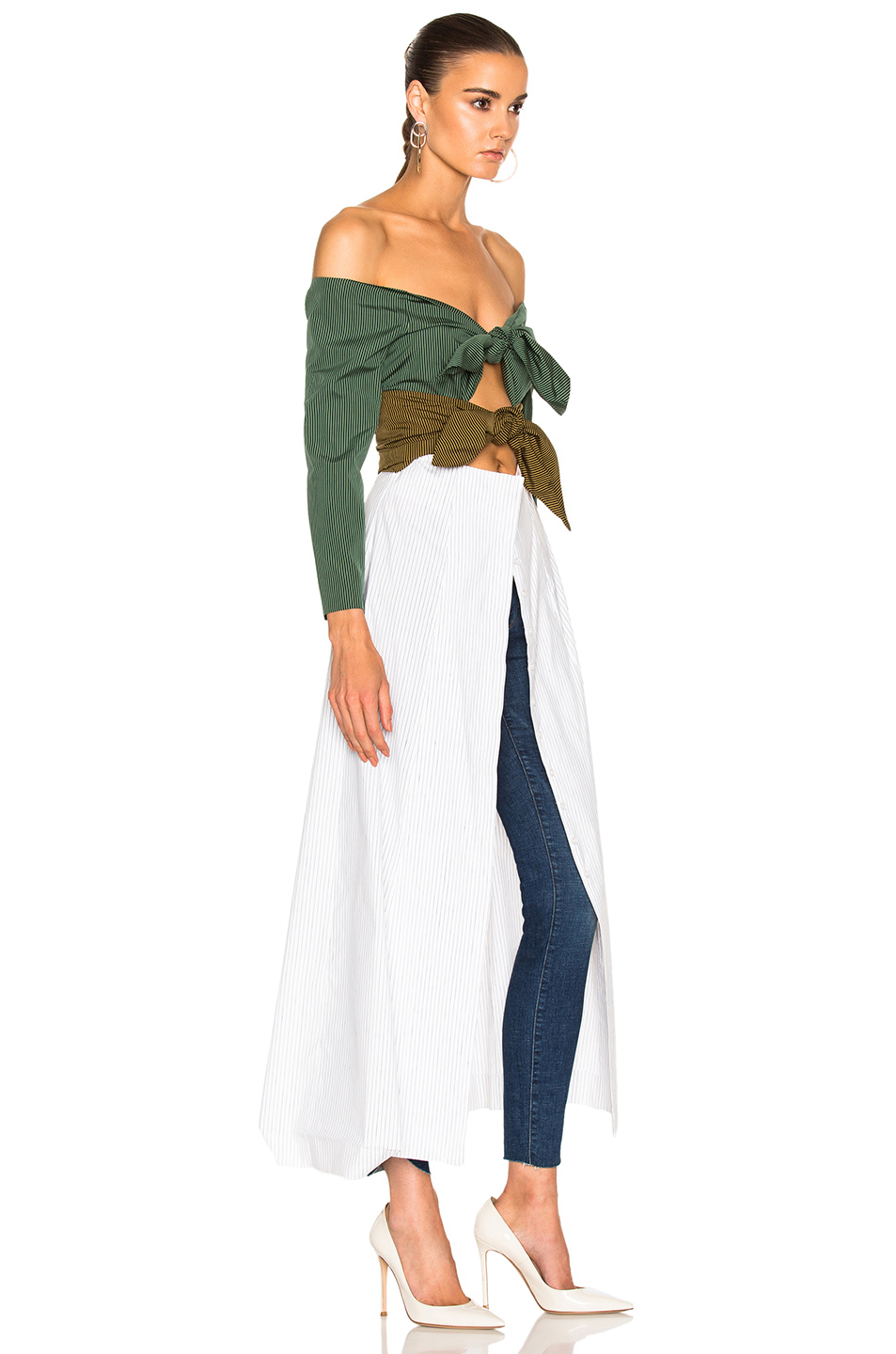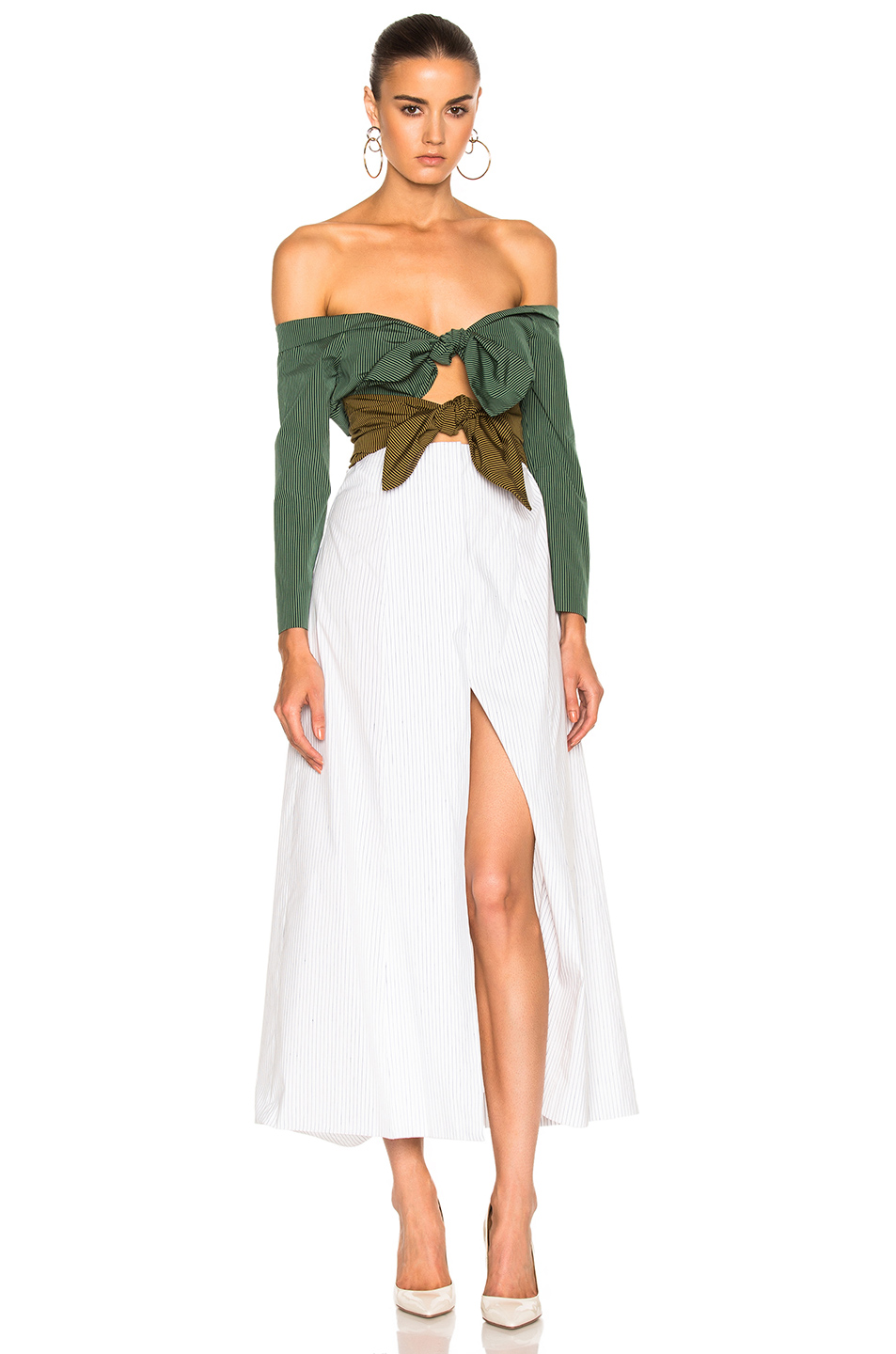Crafted in Italy this piece features an off the shoulder design, double knot bow tie detail, and a midi motif. Hot!