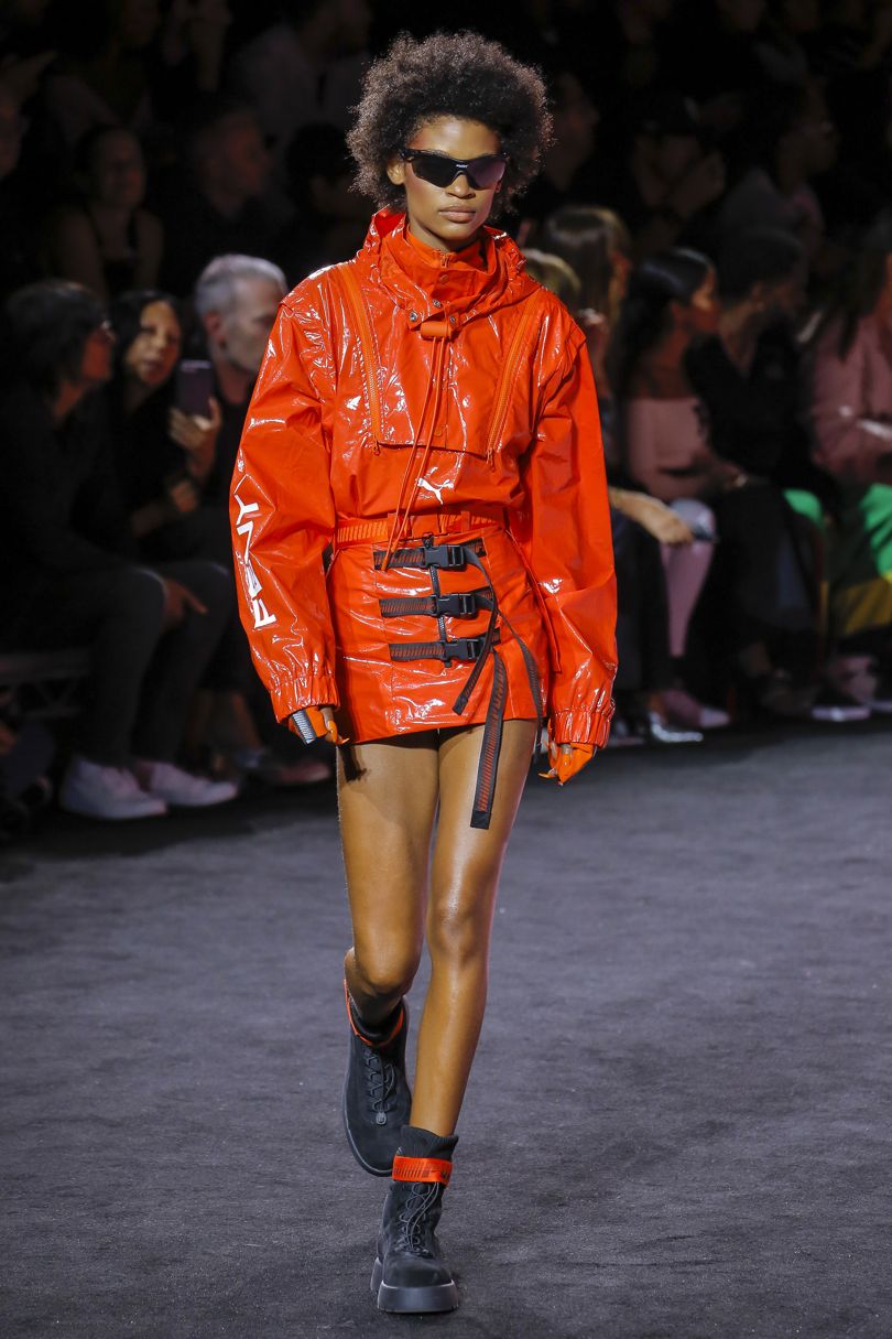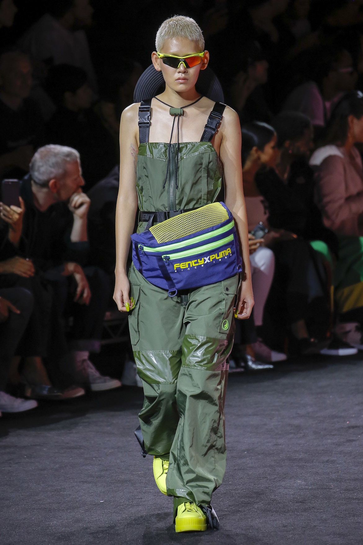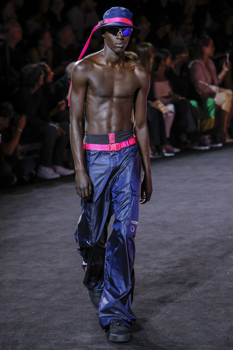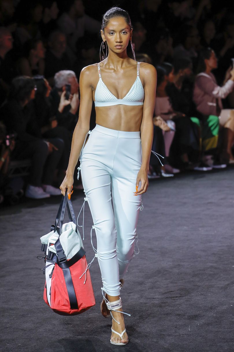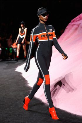 More styles spotted in the collection were layers, which will forever be Rihanna’s thing, new Fenty Puma Creepers, strapped thong sandals, open-toe laceups, and thigh-high boots in nylon, and solid muted tones.