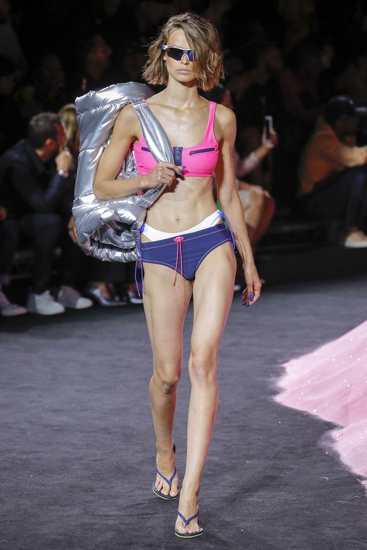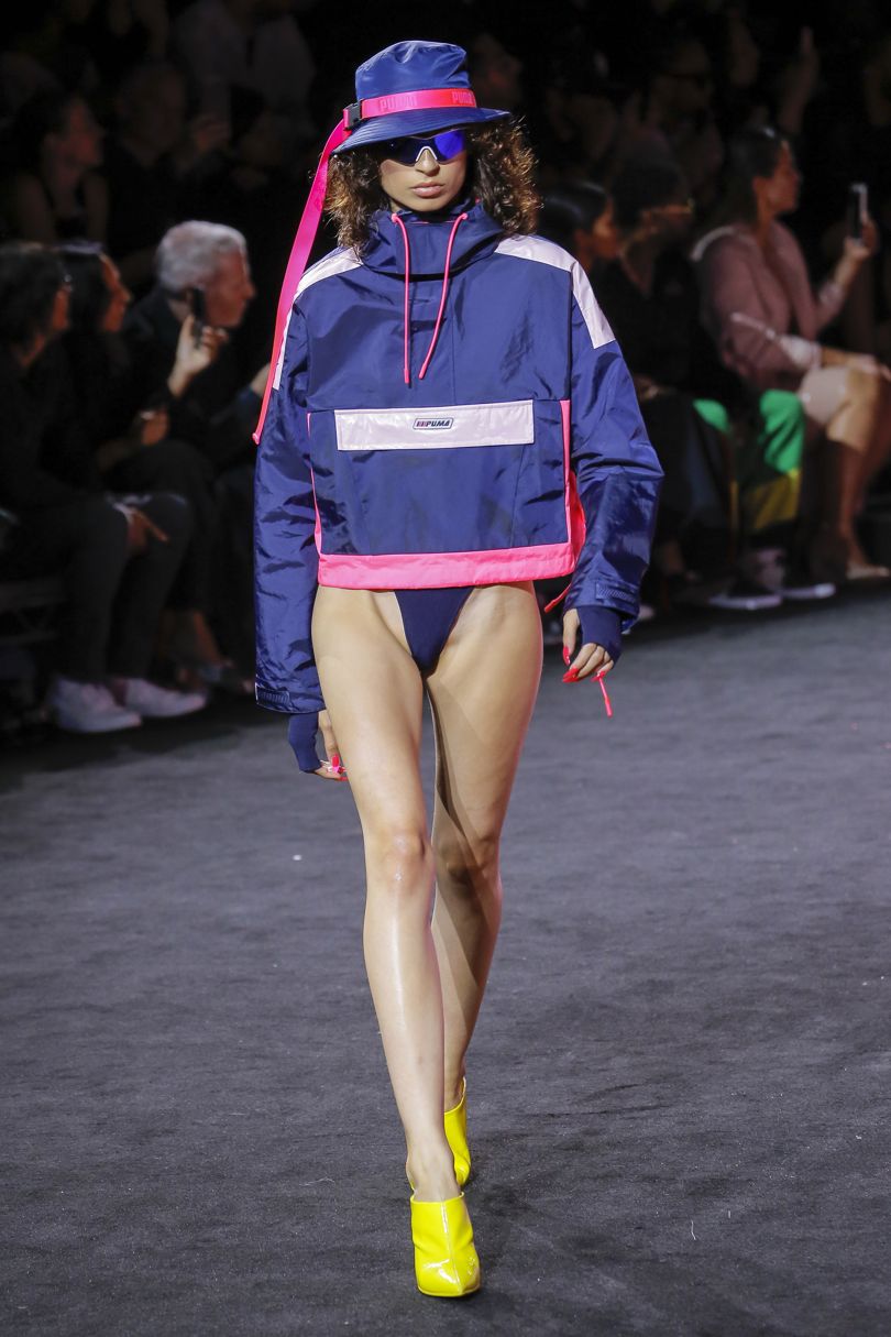 The collection is full of vibrant colors, peek-a-boo laceups, mesh, skintight spandex gear, with a splash of oversized looks including cargo-like sweatpants, and hooded wear.