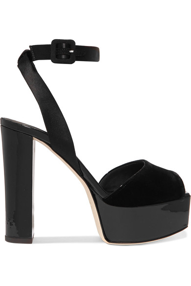 The velvet, leather, and satin sandals are set on a sturdy platform to balance the towering block heel.