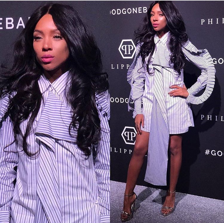 We’re still here for the atypical shirt/shirt dress trend. Lil Mama aka Niatia Kirkland showed out at Phillip Plein’s show in a Apartmento 03 striped shirt dress. Just the right ‘fit to attend an unconventional designers show. Garments are not the only things that pull a look together; it must be replete with hair and make-up, which is exactly what took this look to the next level. Simple yet fierce!