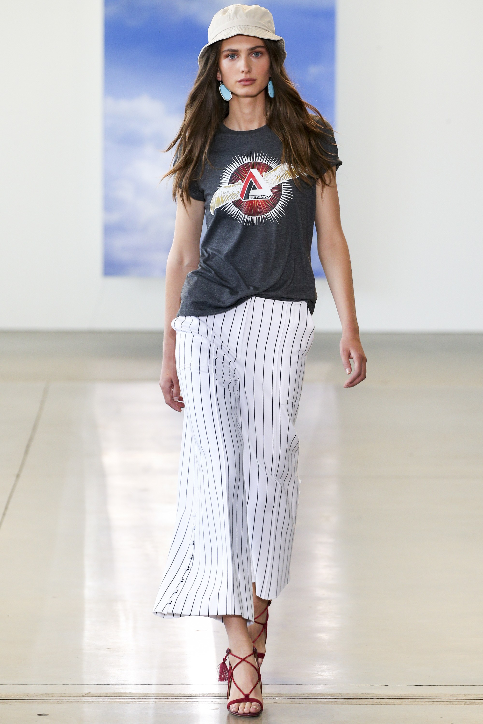 Hellessy also showcased the style with graphic t-shirts, functional striped trousers, and sultry dresses.
