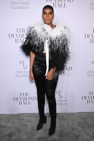 It was all about feathers for EJ Johnson as he arrived with satin pants and ombré feathers.