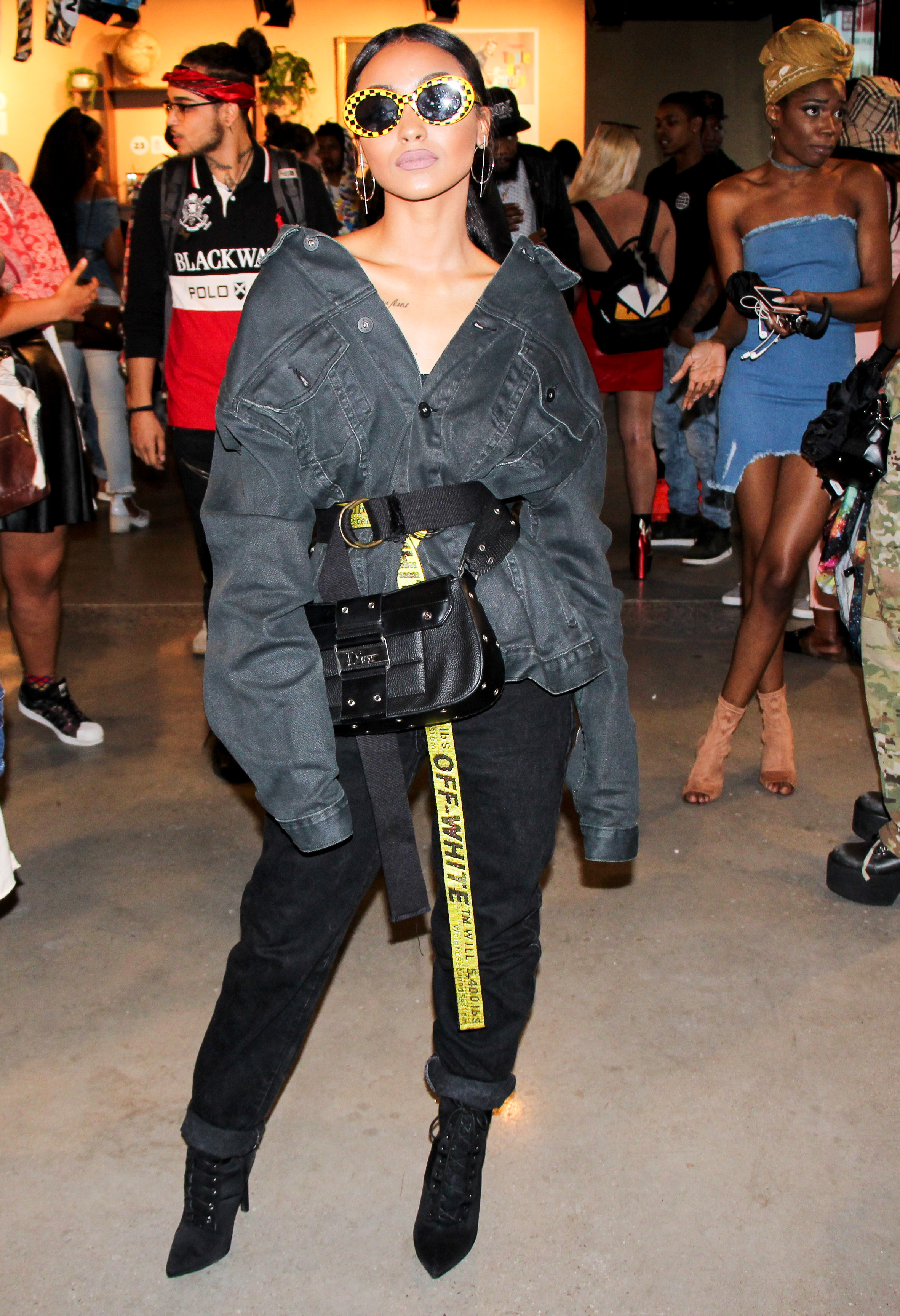 Black and yellow! Black and yellow! Anisa (@af_ali01) came to the G-Star Mat event drenched in oversized denim, added an Off-White black and yellow belt, paired with taxi cab inspired shades.