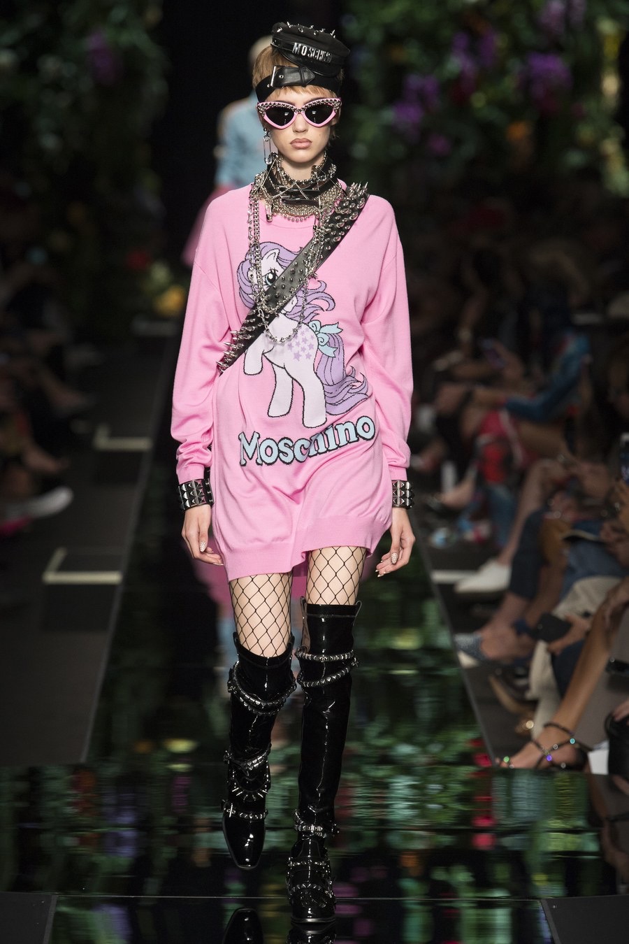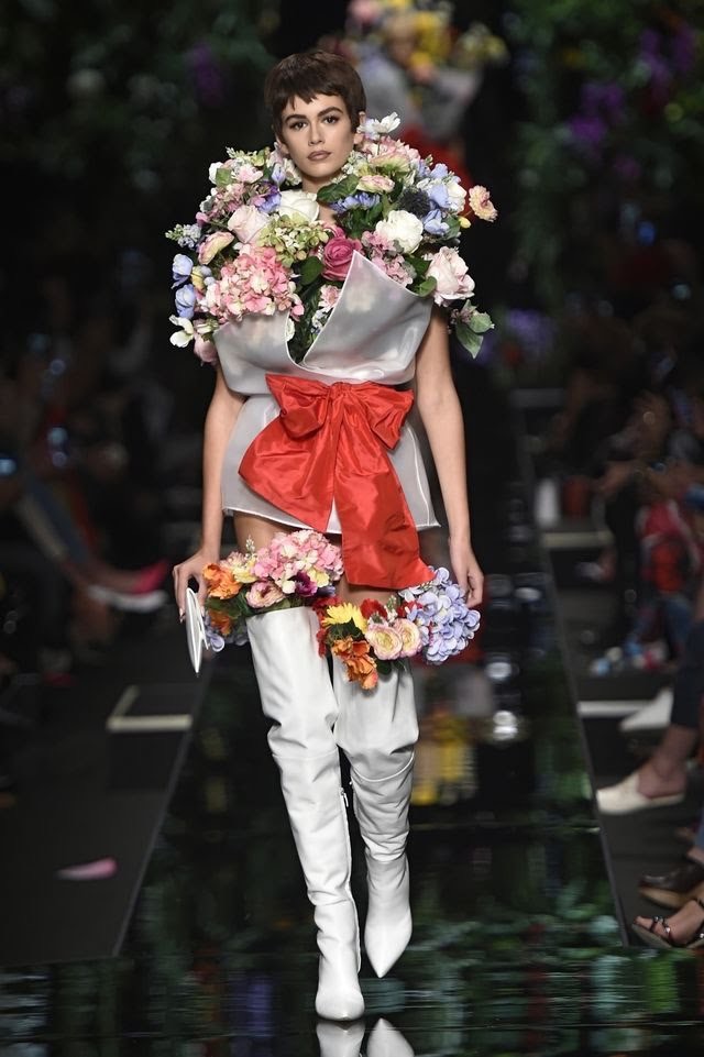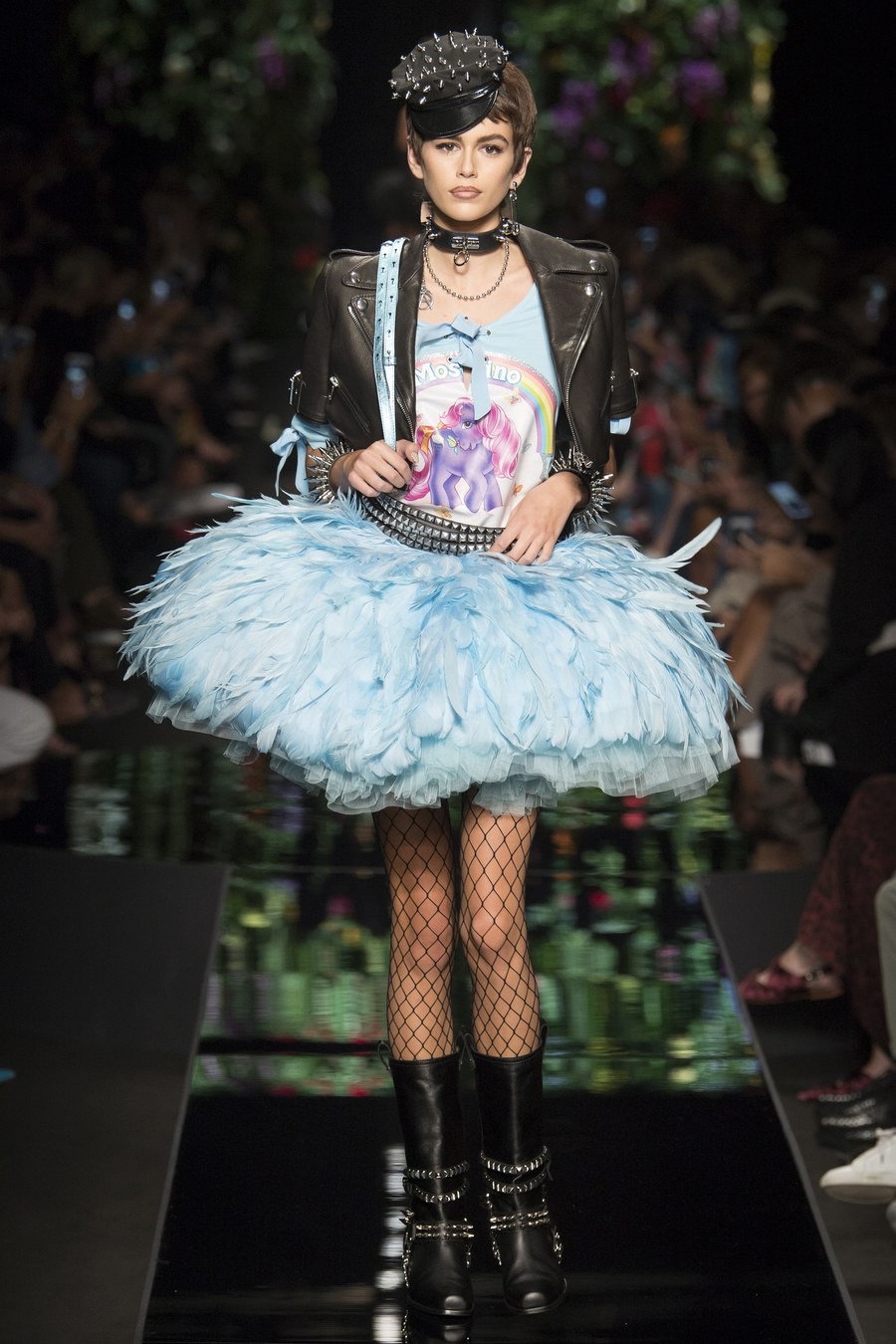 All eyes were on the striking Kaia Gerber as she twirled in Moschino Milano’s 2018 Spring Presentation. The supermodel flainted an elaborate fluffy feathered skirt paired with a cropped leather jacket layered over a graphic My Lil Pony X Moschino tee courtesy of their current collaboration.