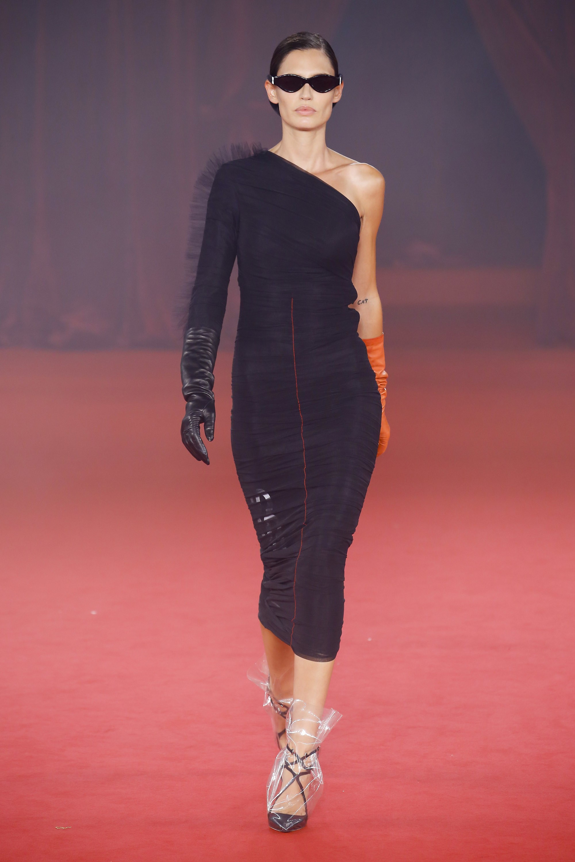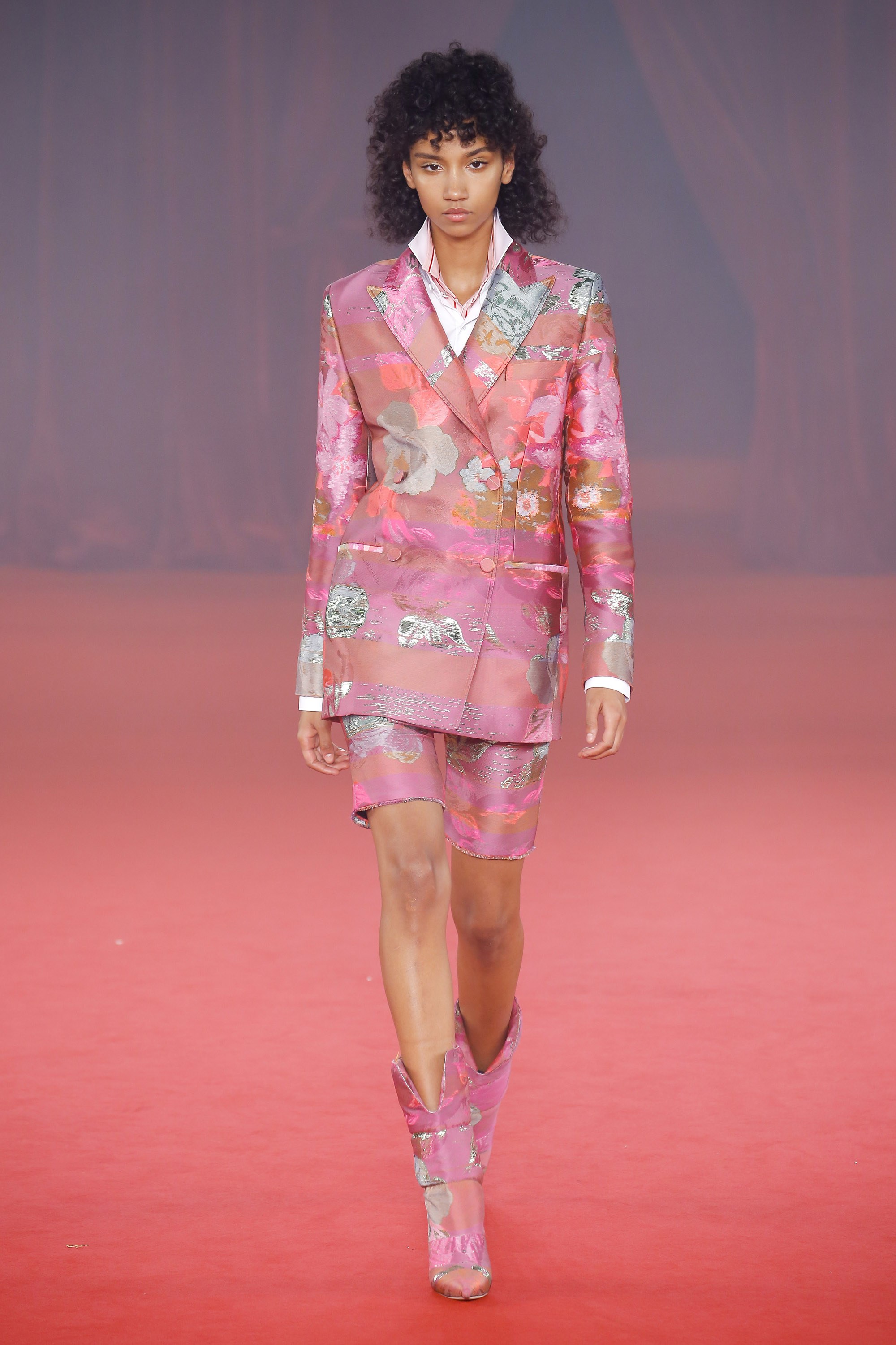 Naomi Campbell closed the show with an all-white asymmetrical elongated buttoned blazer, grey-toned biker shorts, and Jimmy Choo strappy pumps wrapped in vinyl fabric, another signature style to look out for from the collaboration next year.