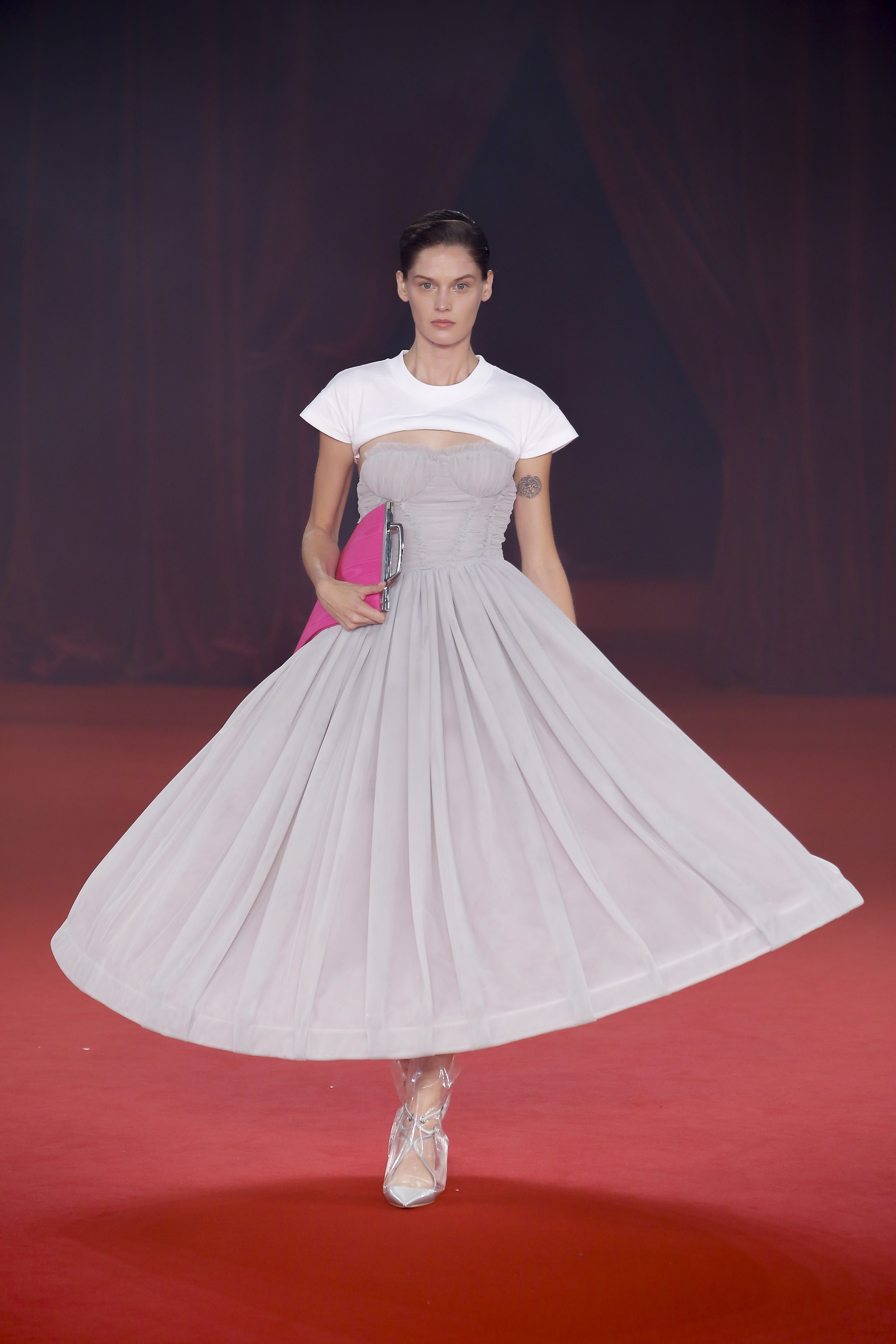 It was a twist to a Cinderella story, as Abloh felt inspired by the late Princess Diana’s style and grace. To add to the royal theme, Jimmy Choo collaborated with the designer to introduce a new level of luxury meets punk rock edge than the typical timeless approach. Soothing sounds of nature played as each model walked in with looks that were sophisticated, edgy, and a modern-day reflection of how the princess would turn her look from businesswear to evening wear.