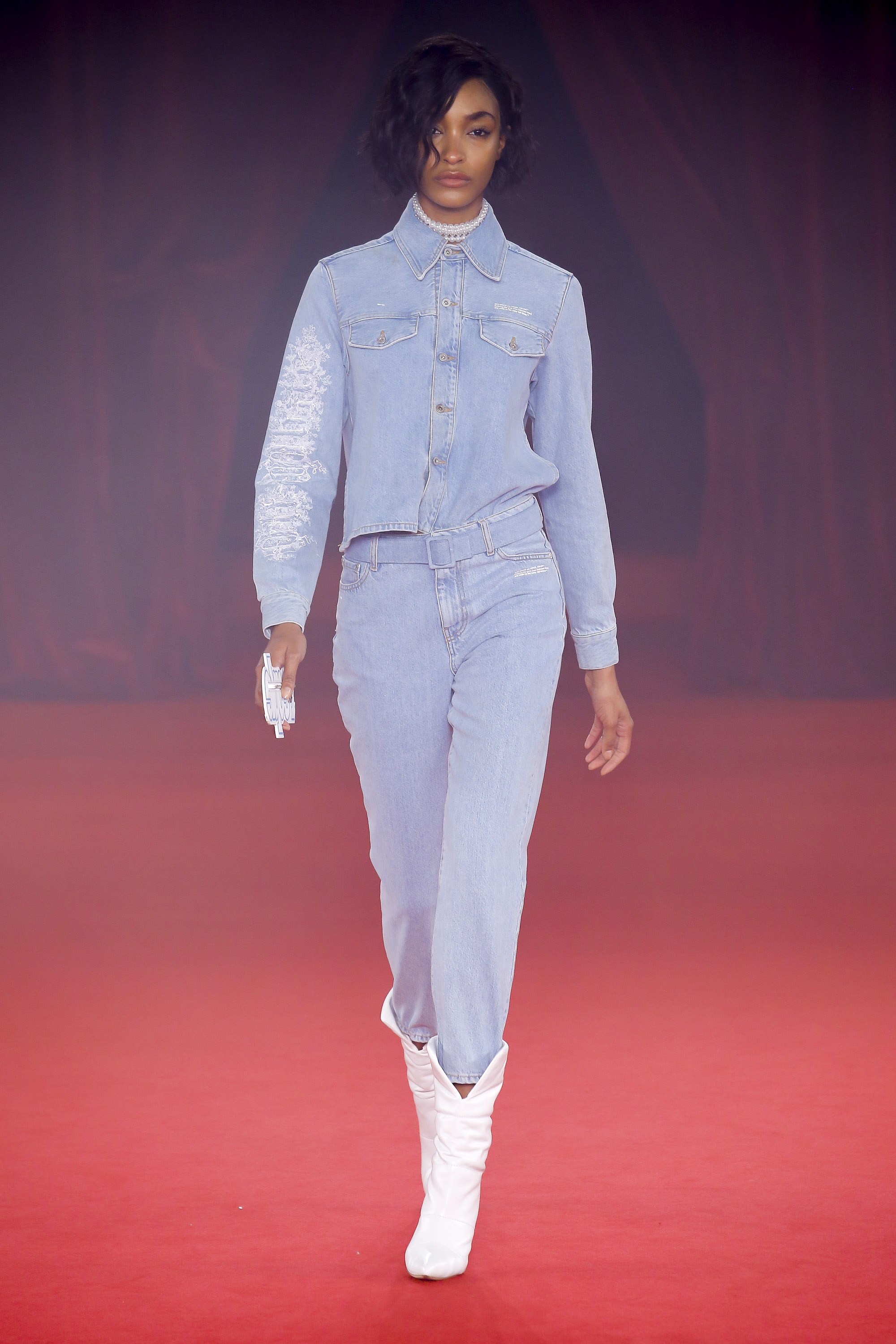 Jourdan Dunn strutted the more relaxed look seen in the collection. Denim on denim is not going anywhere anytime soon, neither is distressed denim and to make this look more appealing to the masses he added pearls, which is known to be a girl’s best friend.