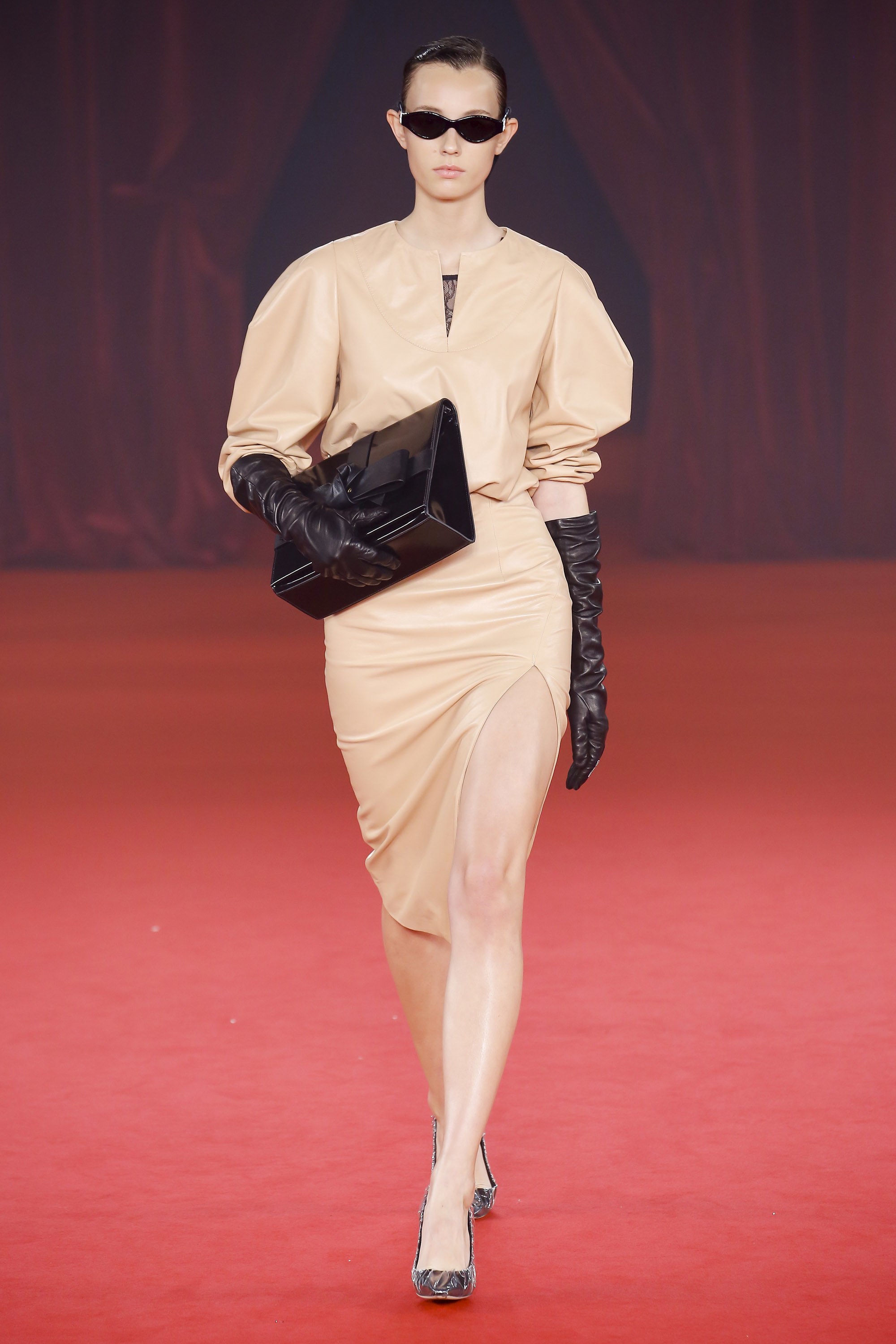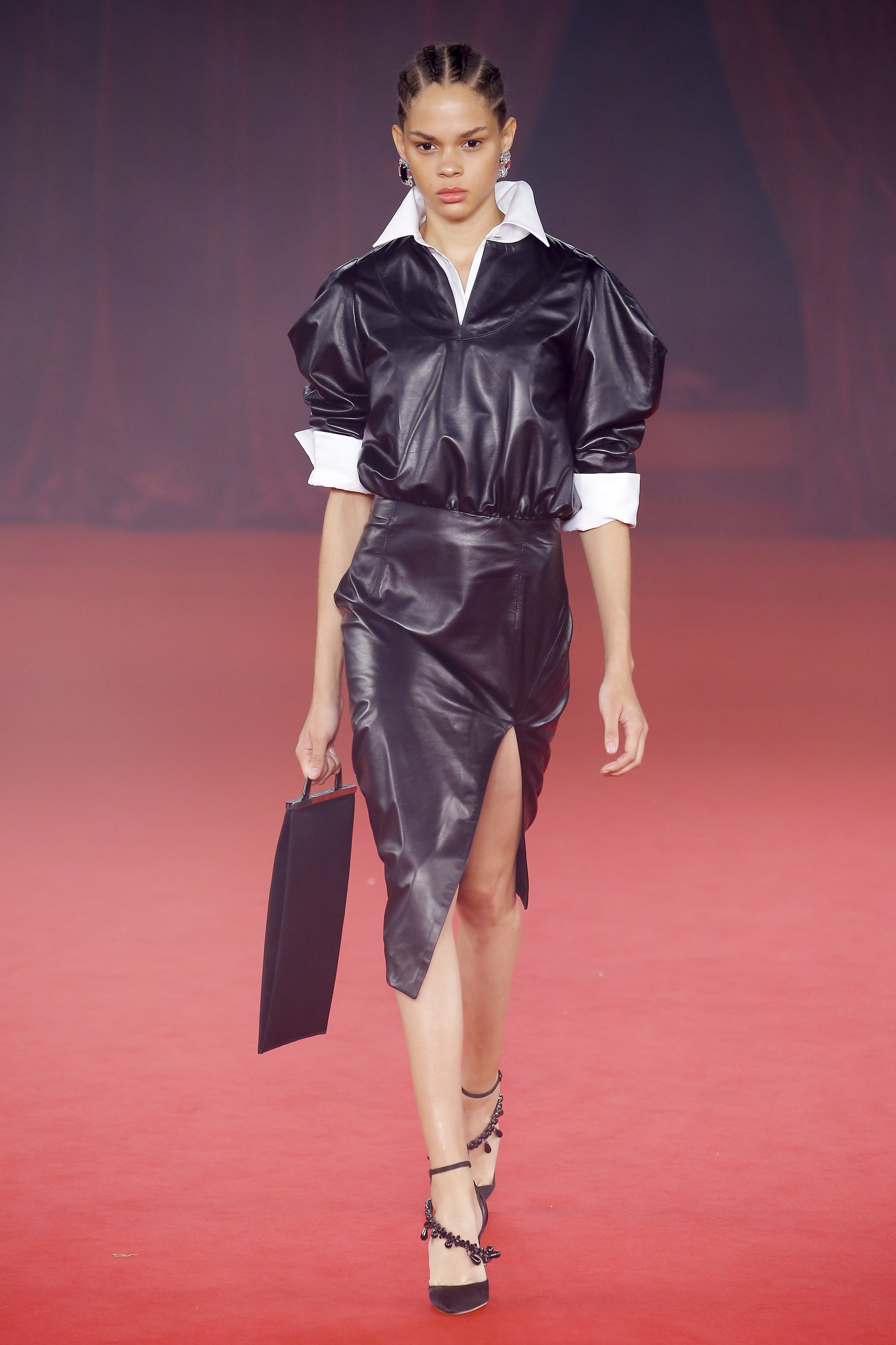 The ’80s era was seen throughout the collection: puffy sleeves, patent leather, collars were worn up (instead of down), hot pink, and cinched cropped off-the-shoulder sleeves to name a few. Even Jimmy Choo took the ’80s to a new level, as he designed pumps with an oversized bow to introduce one out of a few signature styles from the collab.