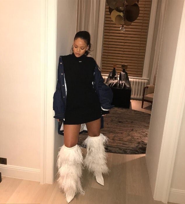 I mean, YSL has done it again with these furry boots Riri posed in. I know I do not stand alone when I say, the boots are the only things I see in this picture; not the mini dress, not the room decor, but THE BOOTS! Rih, is always one to make a statement and this was no exception. Talk about a wow factor!