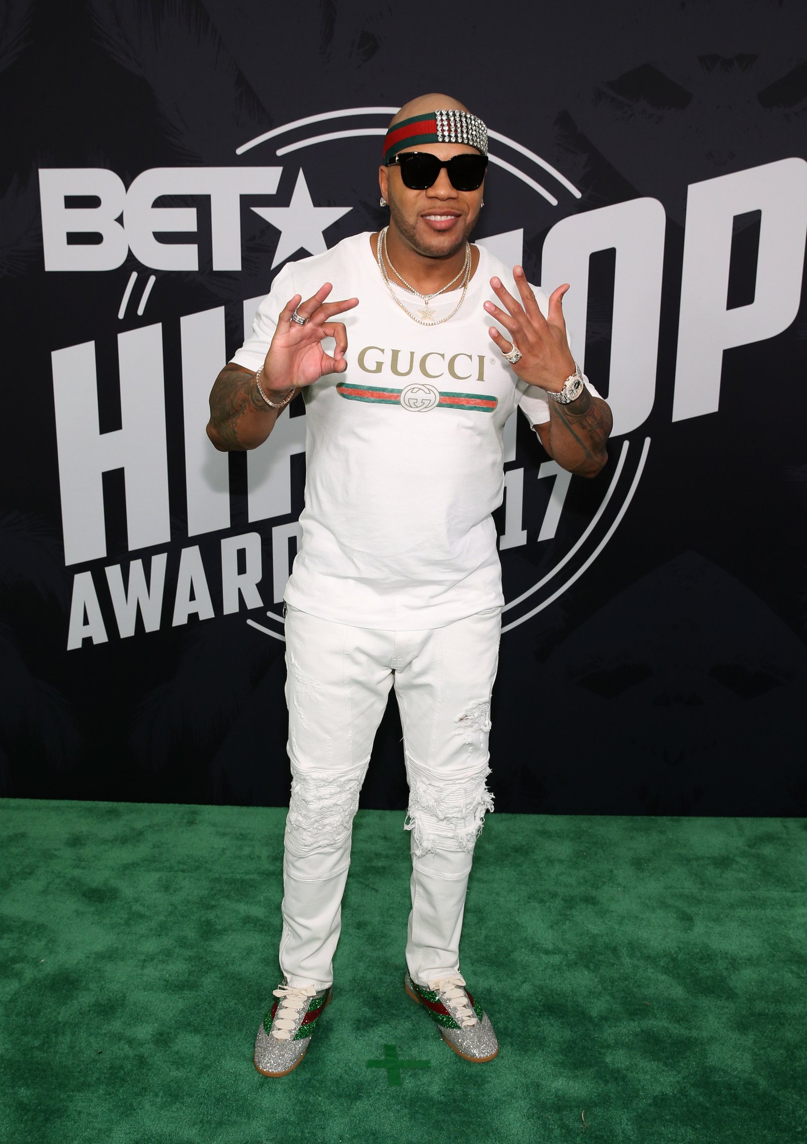 Flo Rida was decked out in Gucci from head-to-toe with a bedazzled headband, tee, and sneakers all by Gucci.