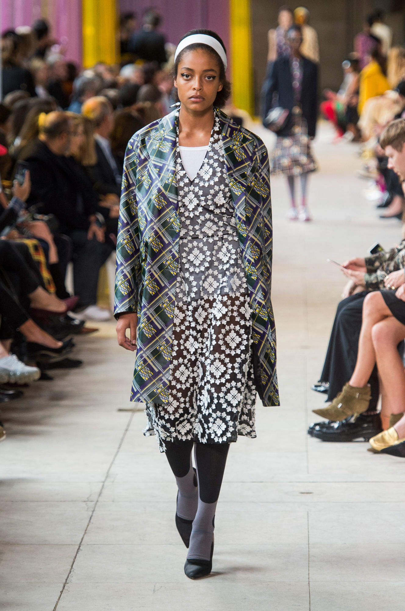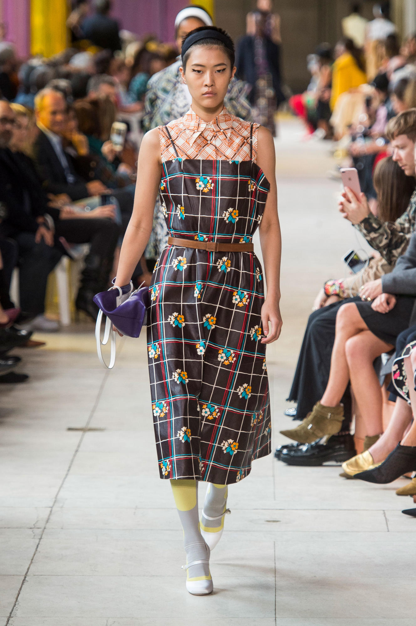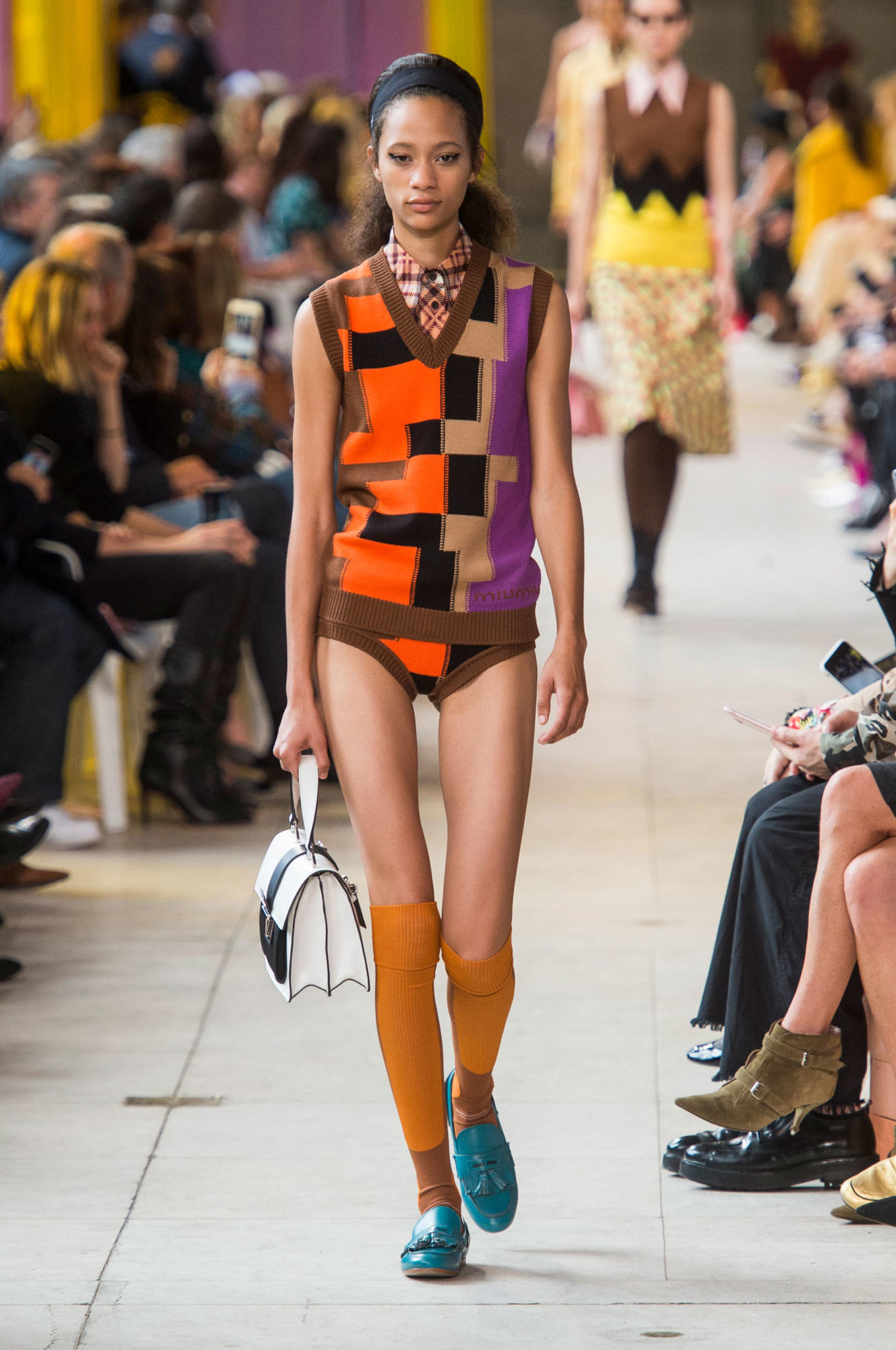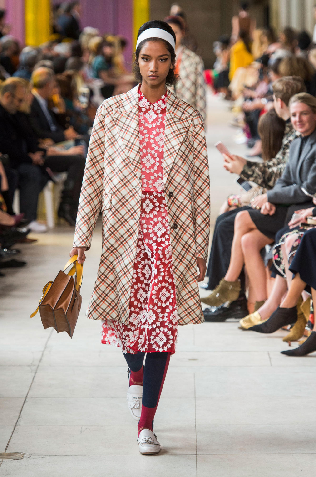 Headbands added to the collection’s retro-inspired vibe, as did quirky shades, tasseled loafers, and knee-high socks.