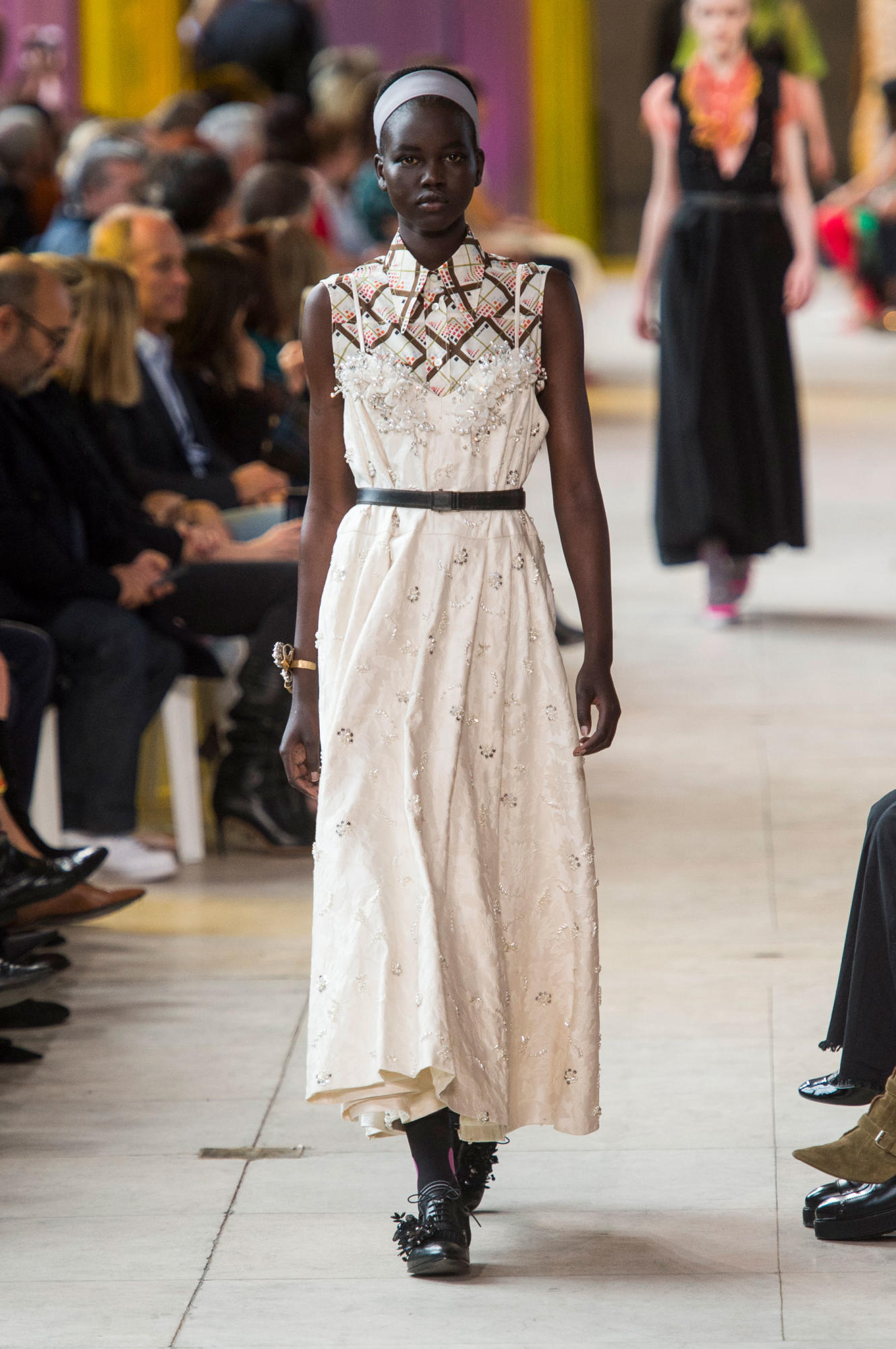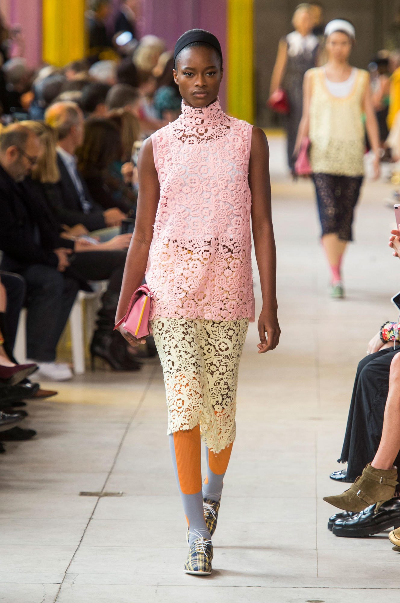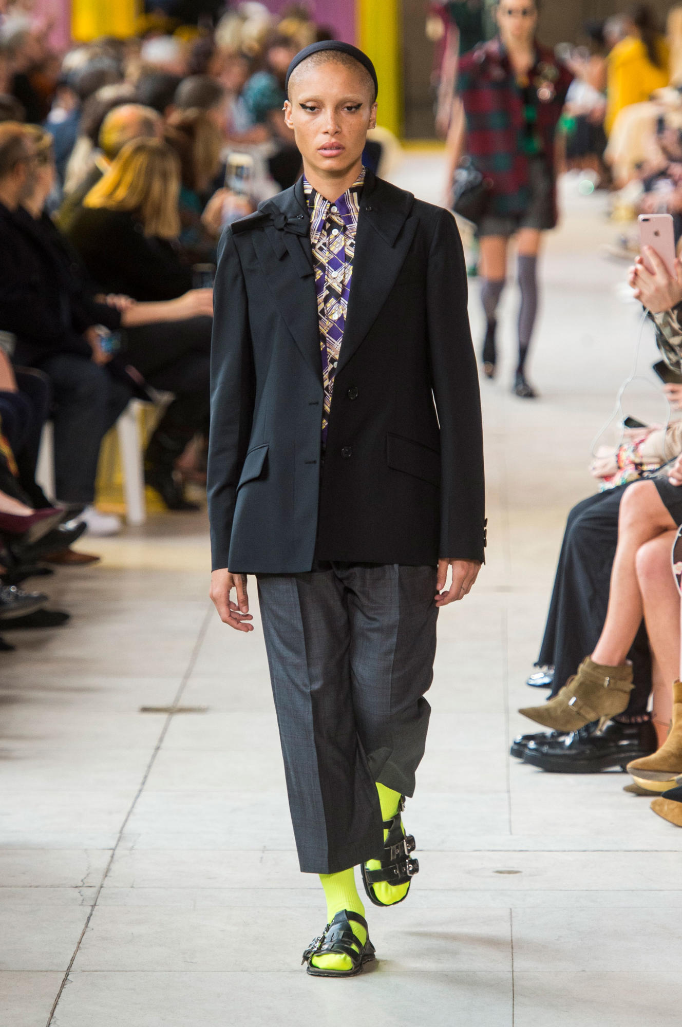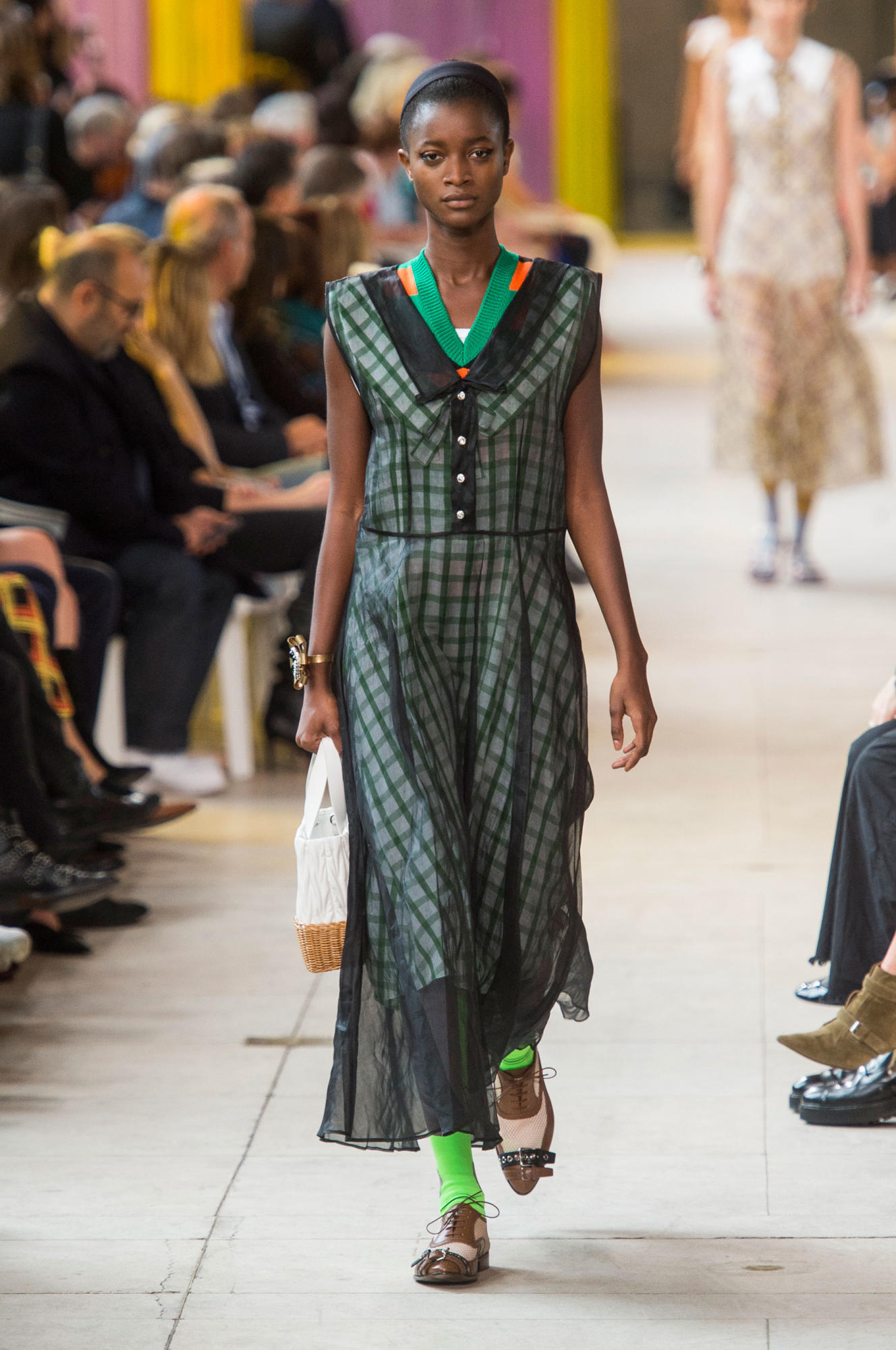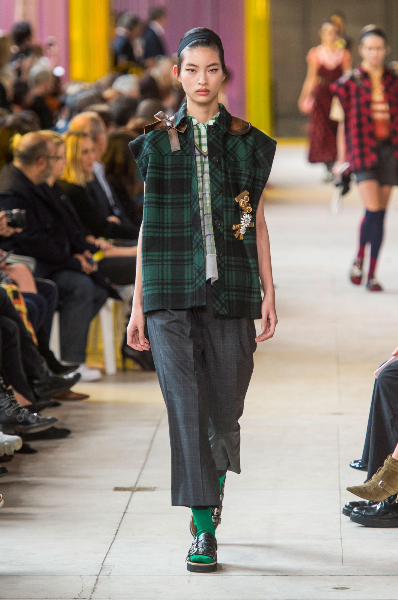 Headbands added to the collection’s retro-inspired vibe, as did quirky shades, tasseled loafers, and knee-high socks.