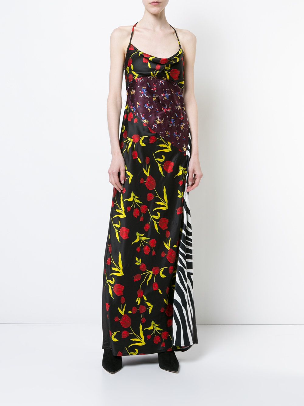 Her dress features a mix of floral patterns and a zebra print—in a slip silhouette with a tie halter neck.