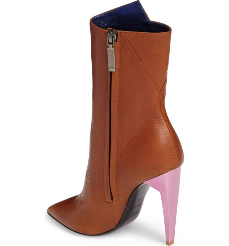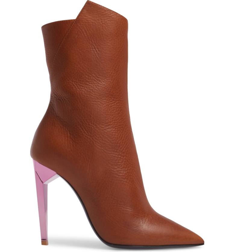 An asymmetrical topline adds to the standout style of this Italian made pointed-toe bootie.
