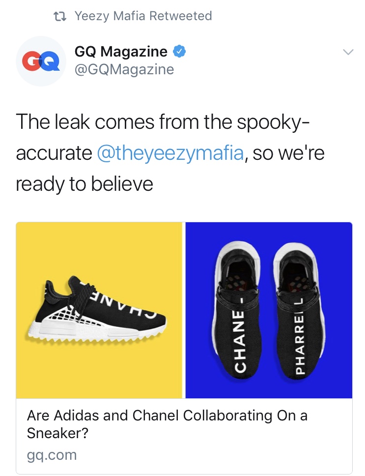 According to @Yeezymafia, a fashion avenue on Twitter, which is popular for updating Adidas and Yeezy crazed fans on new releases, unreleased designs and more, posted a sample pair of the speculated Pharrell x Adidas x Chanel collab.