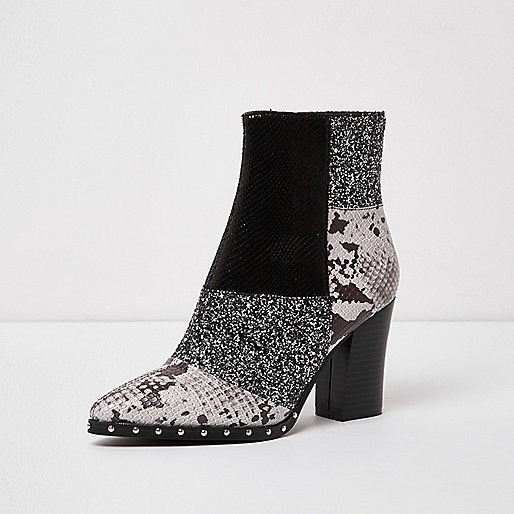Today’s Bomb Product of The Day comes courtesy of River Island. Behold these Black Glitter and Snake Print Patchwork Faux Leather Block Heel Boots!